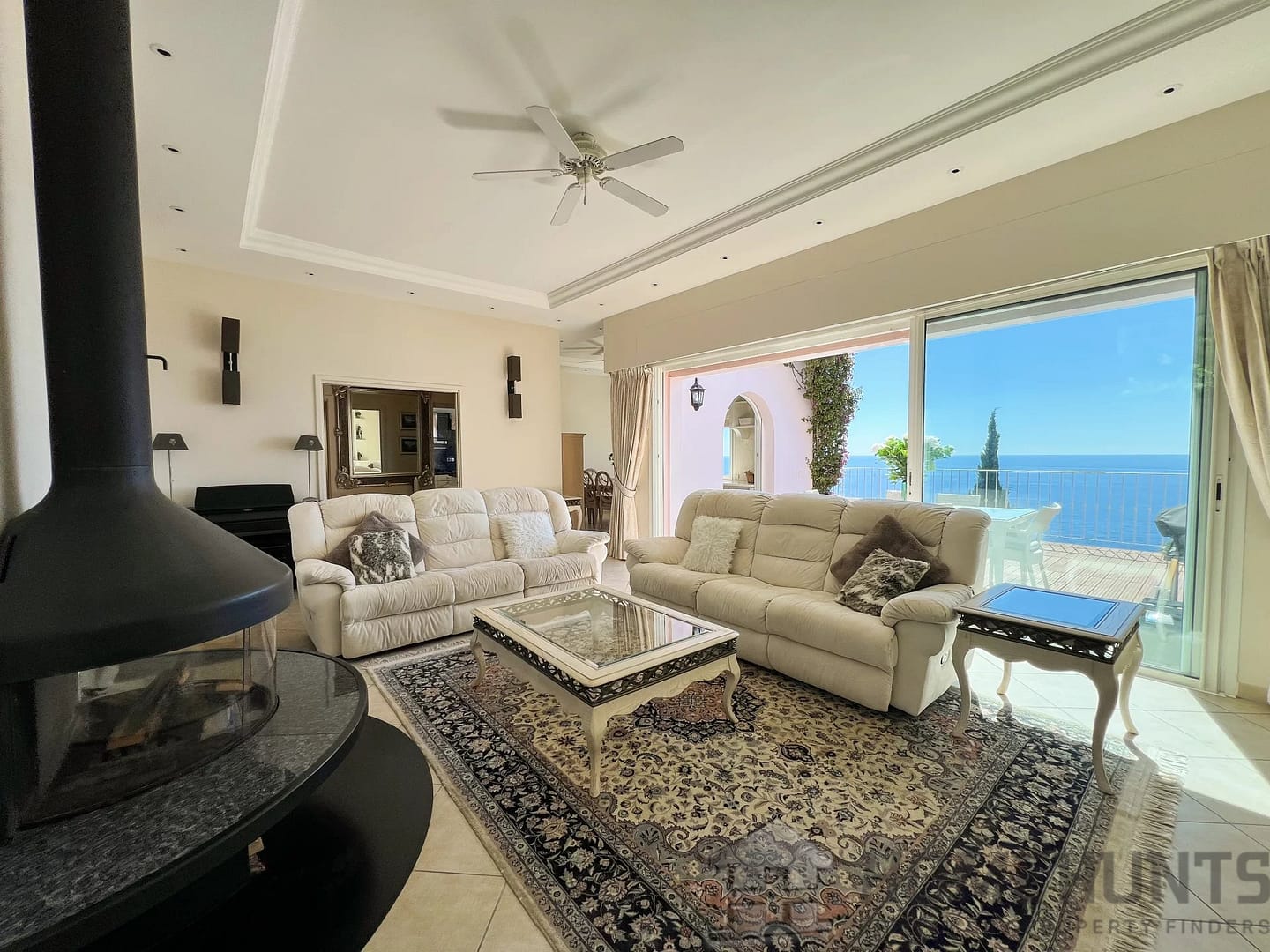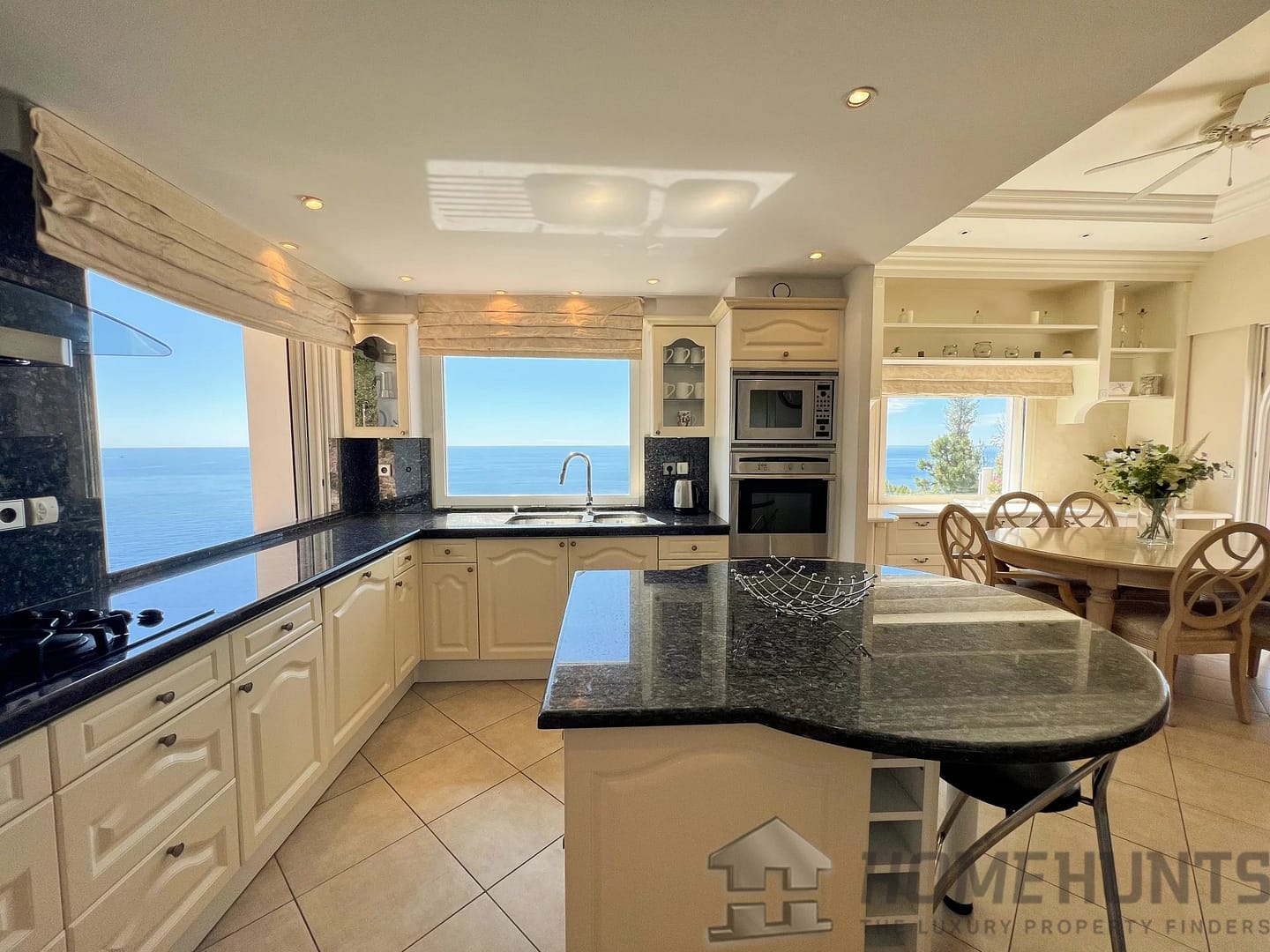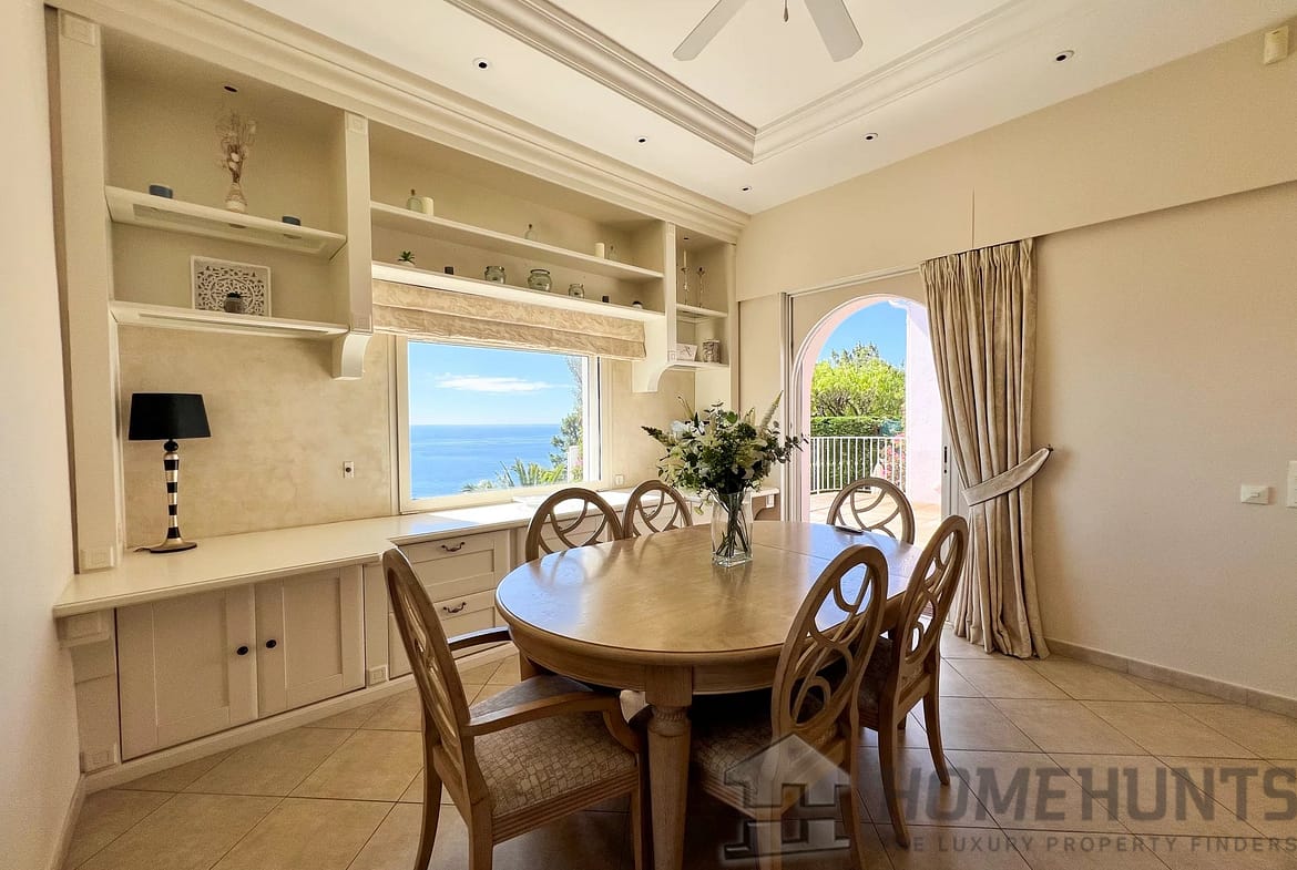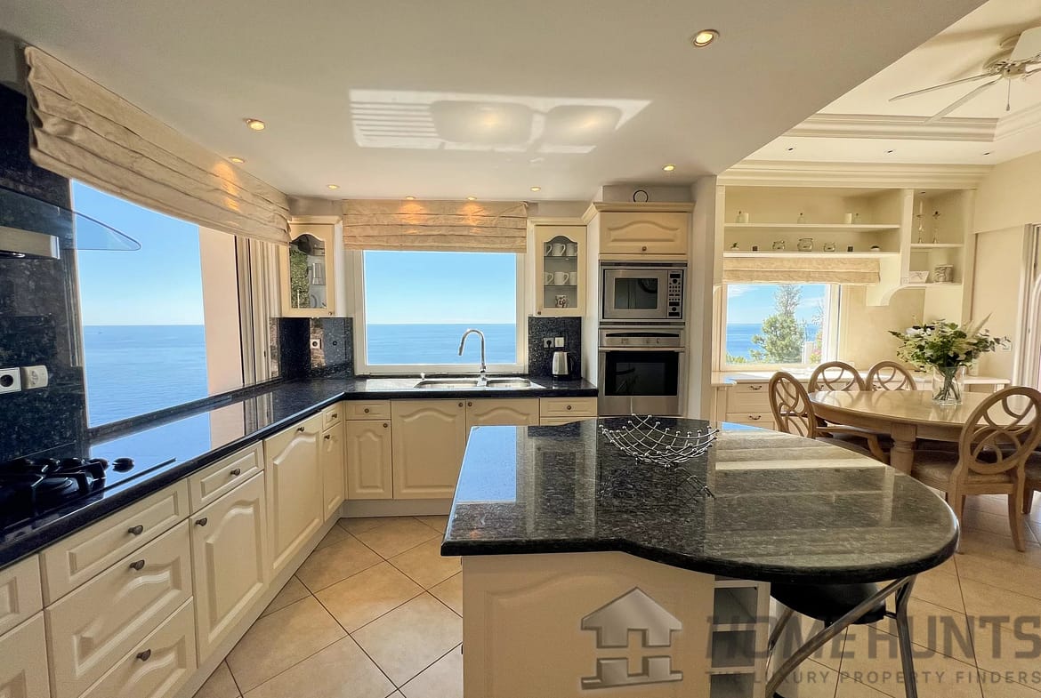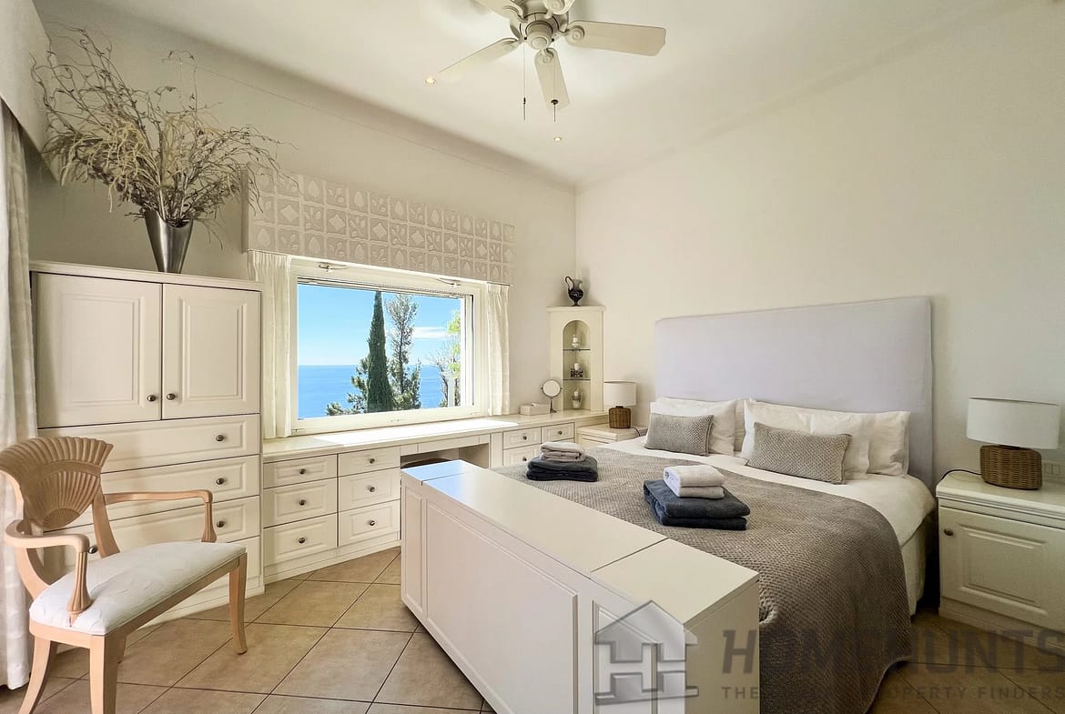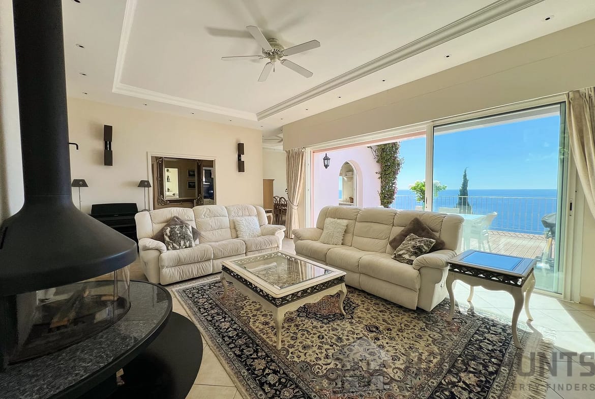 Perfectly perched on a hillside and bathed in sunlight, the villa unveils a generous open-plan living area that seamlessly connects a spacious living room, a dining area, and a fully fitted kitchen, all opening onto a sun-drenched terrace with unobstructed views of the shimmering sea.