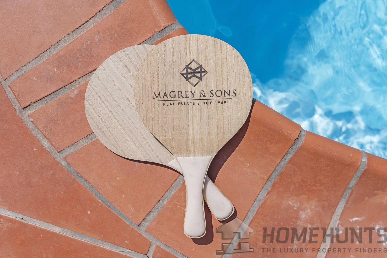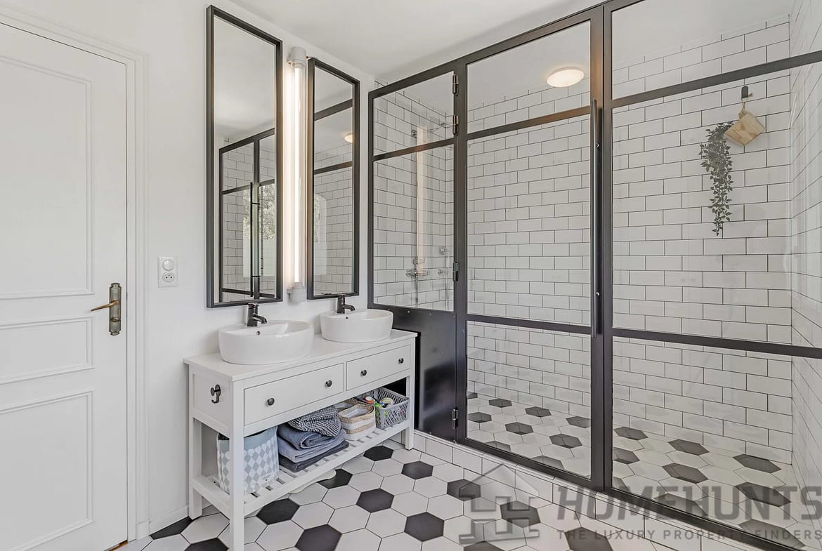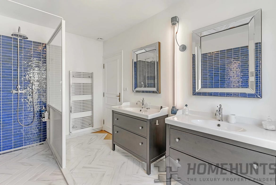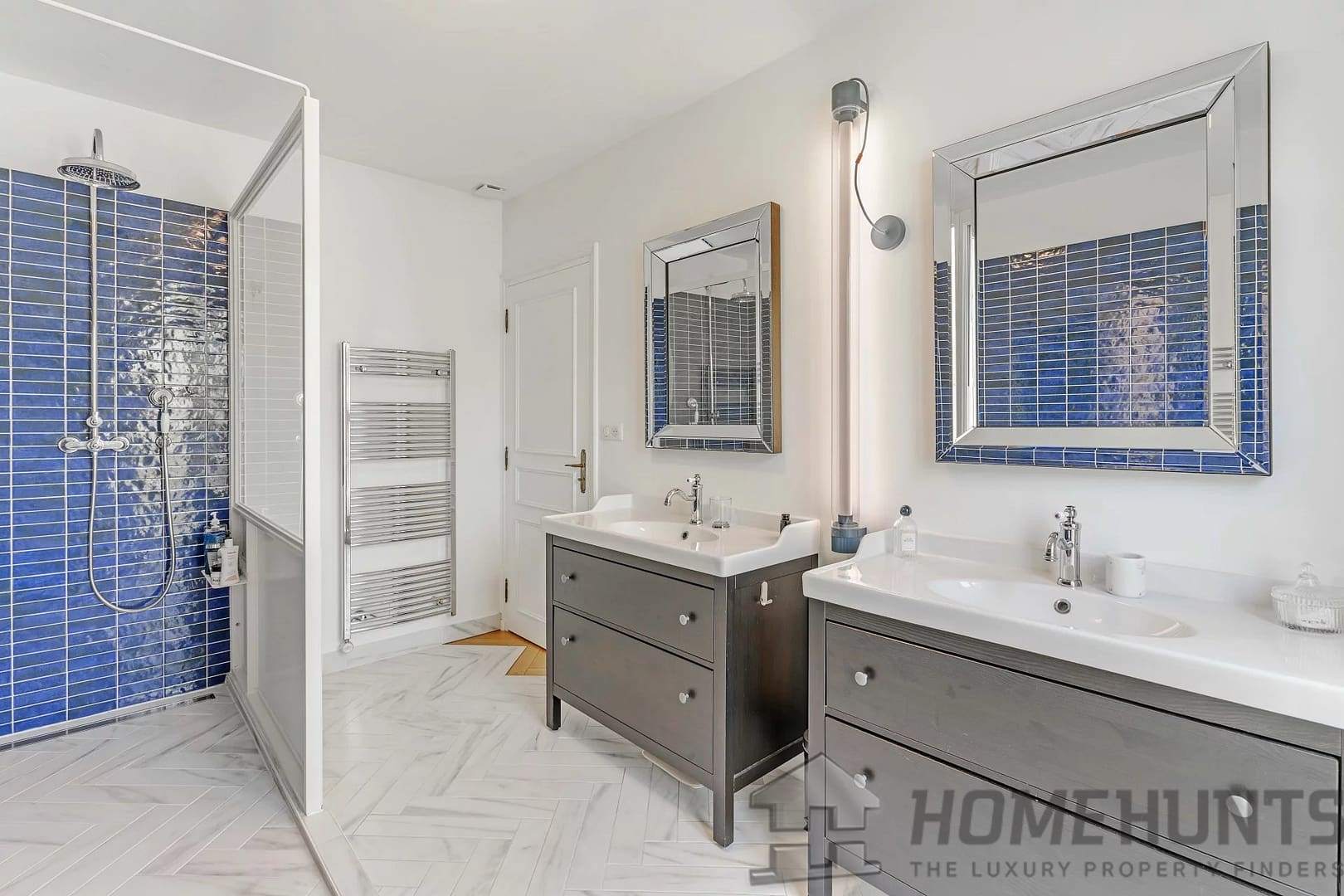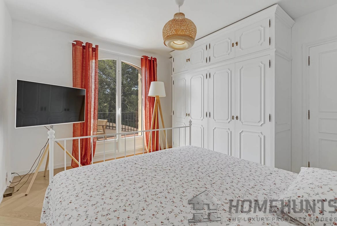 Upstairs, the night area includes two master suites with walk-in closets and en-suite bathrooms (one with a private terrace), as well as three additional bedrooms sharing a large bathroom and a separate WC.