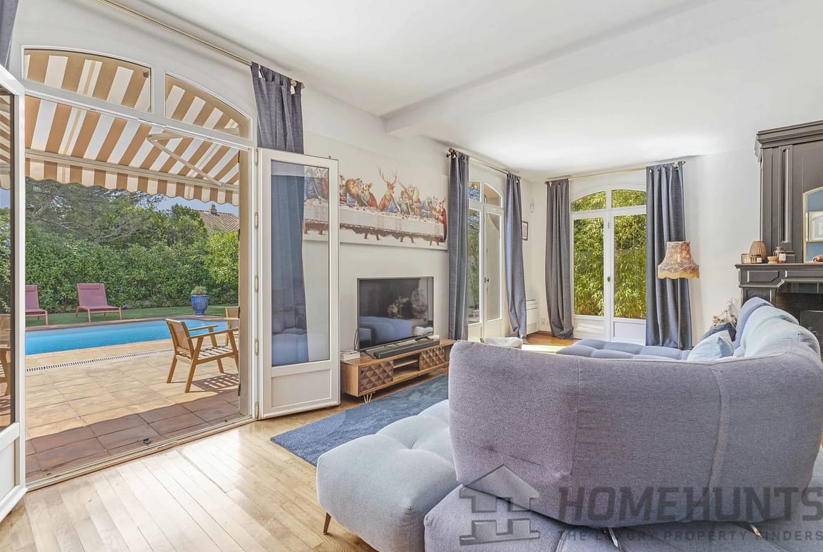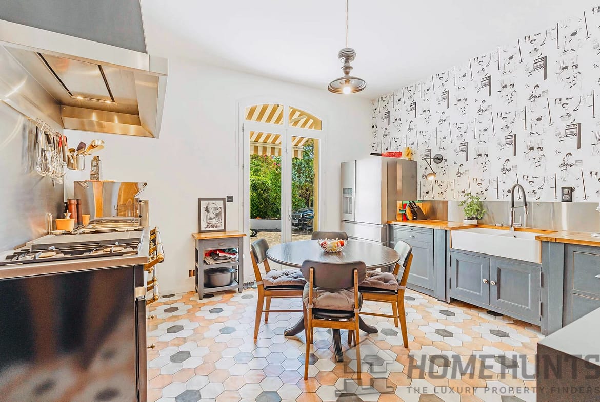 The ground floor features a vast living room with solid wood flooring and a marble fireplace, a separate kitchen equipped with a Lacanche gourmet range, a large dining room opening onto the pool, a playroom, an office, and a utility room.