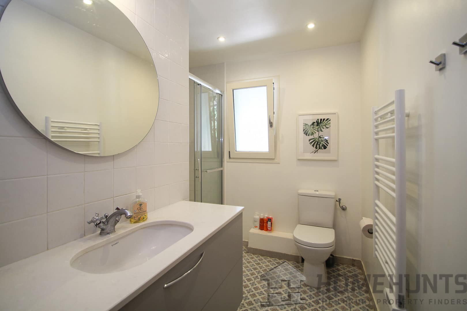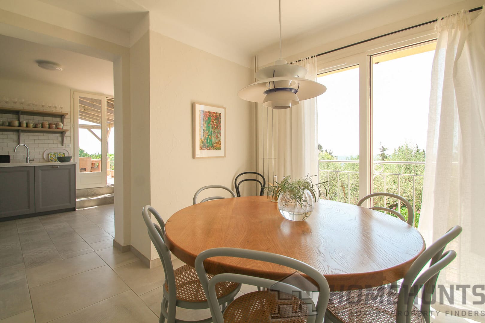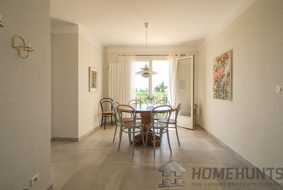 Villa in perfect condition: entrance through the small glass roof, living room and dining room pleasantly bright and you enjoy the beautiful view. The dining room is semi open to the living room and the kitchen. From the kitchen you directly access the beautiful spacious terrace with also the splendid view. On one level you find a bedroom and a bathroom with WC.