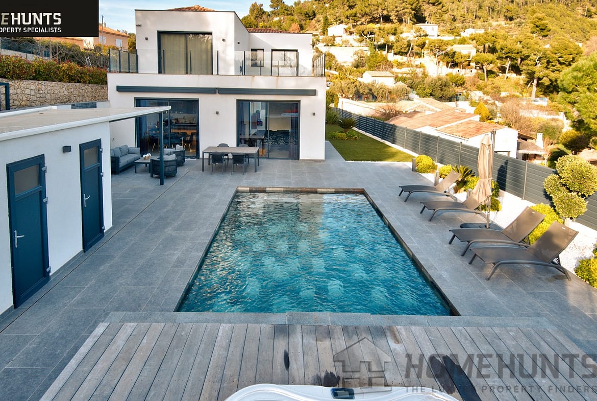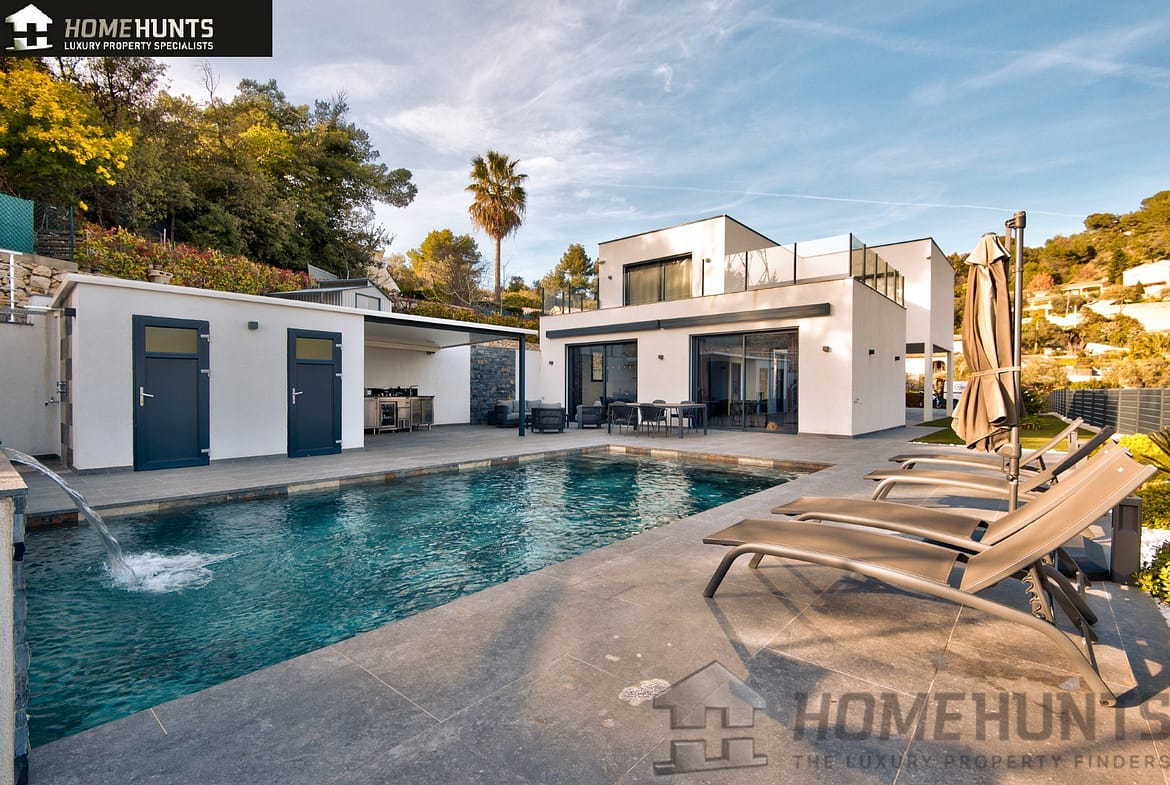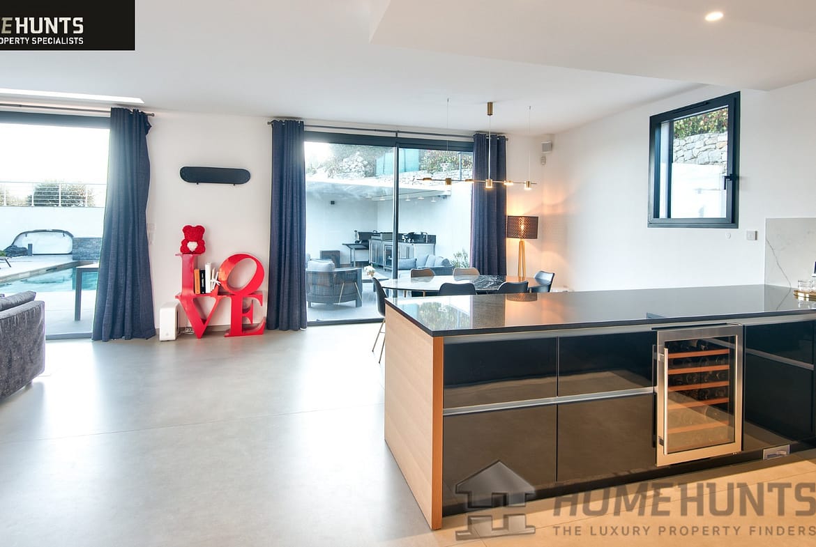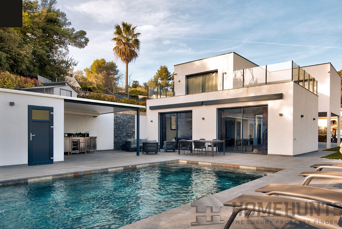 This 5-room villa offers generous floor space, a heated swimming pool with sun terrace and summer kitchen, 4 spacious bedrooms with storage, including a magnificent master bedroom with terrace, a modern, fully-equipped kitchen, a bright living room with large bay windows opening onto the outside, a landscaped, intimate garden, a garage and numerous parking spaces.