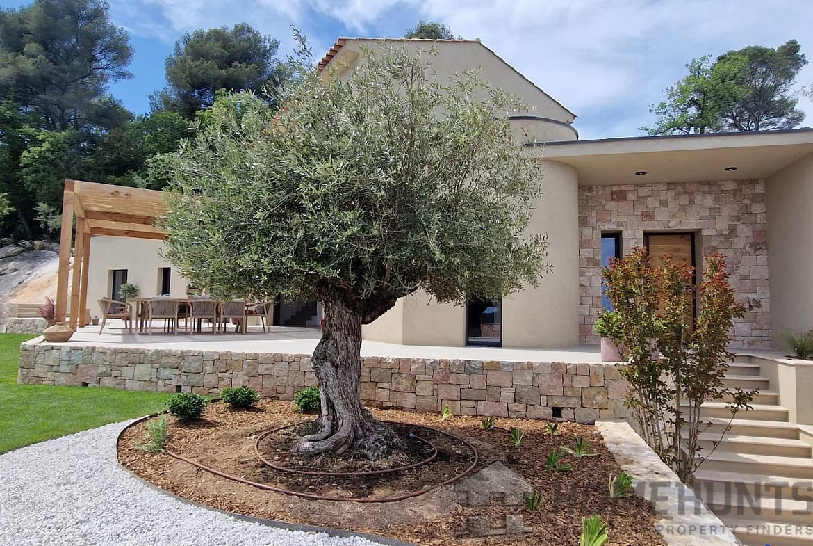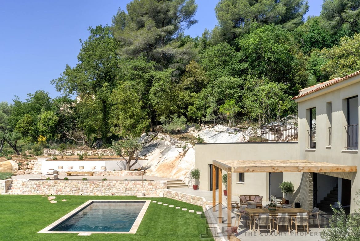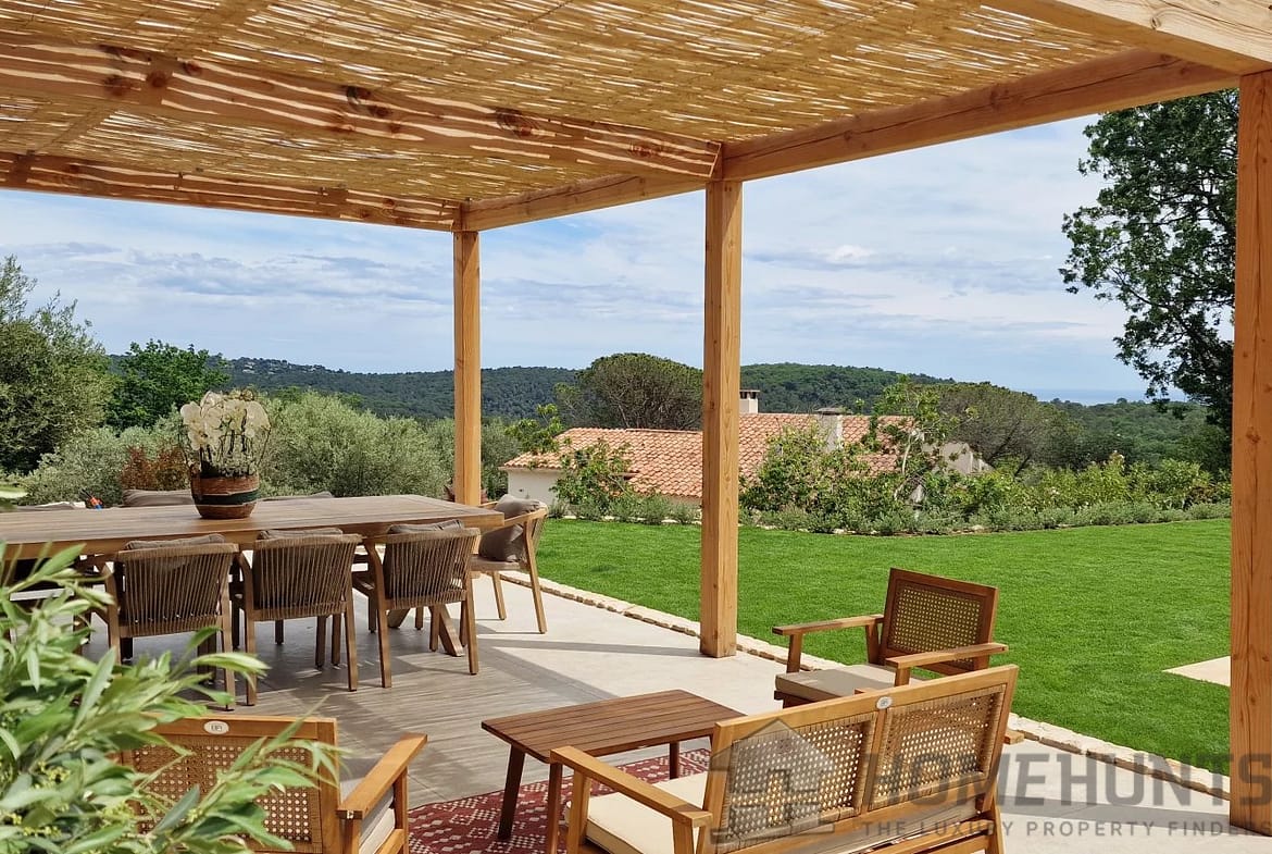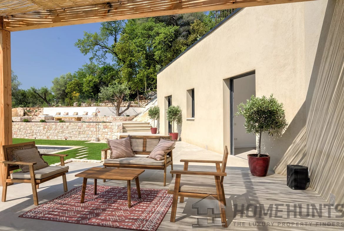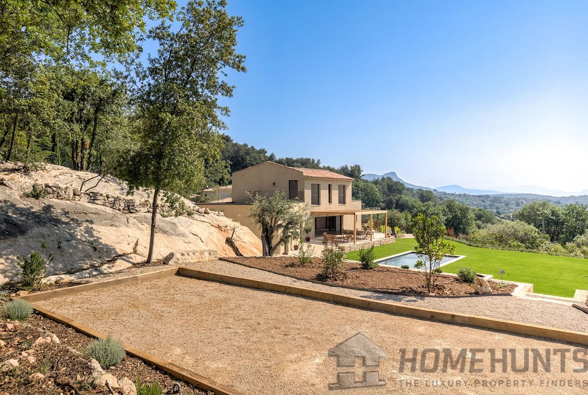 The villa offers a perfect combination of charm and modernity thanks to the stone terraces and the high-quality contemporary materials that have been chosen. In a dominant position, it offers a flat landscaped garden with a salt pool, relaxation areas overlooking the exceptional view, as well as a boules court.