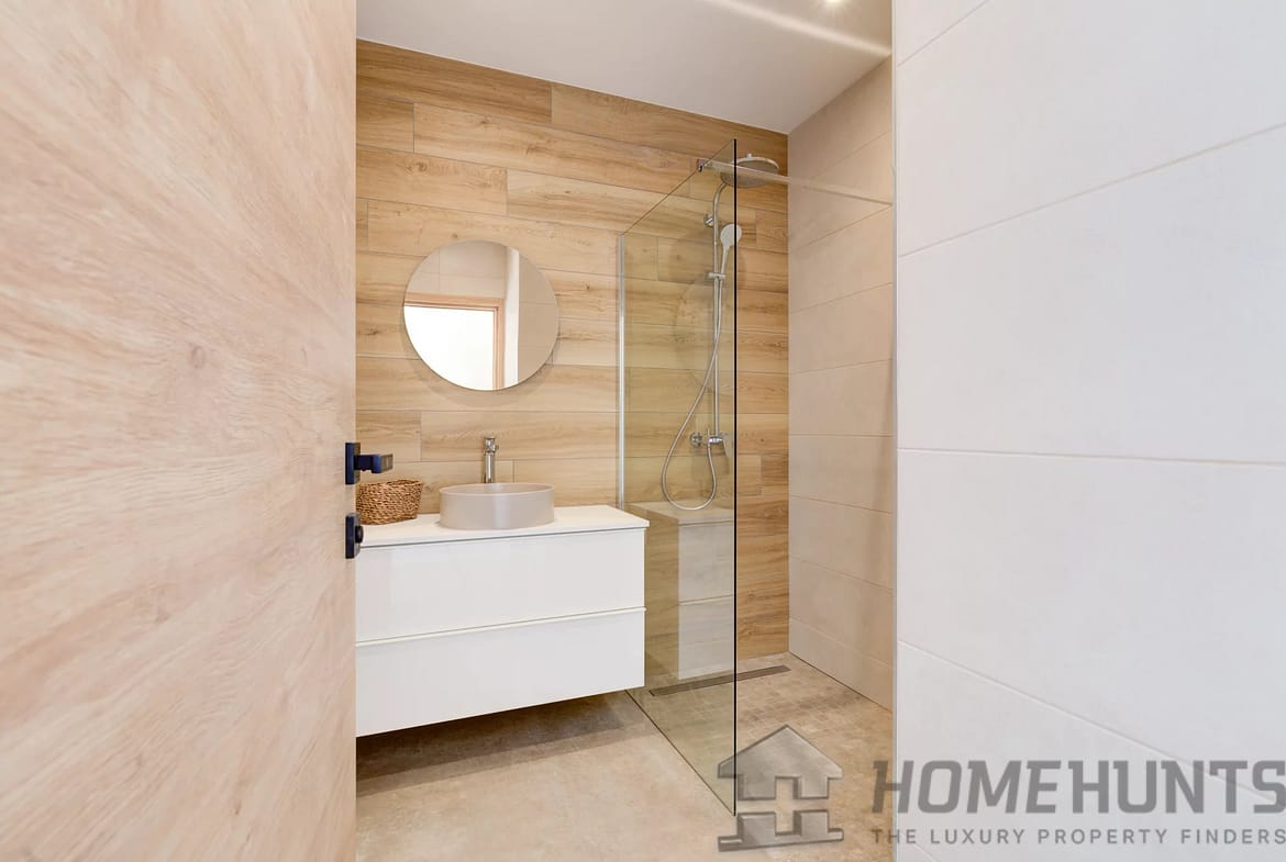 It consists of an entrance opening onto the living room and the dining room, an open kitchen with a pantry and it’s direct access to the double garage. It has two suites on the ground floor including the master. Upstairs, two bedrooms and a large terrace. An extension of approximately 50m2 is possible upstairs.