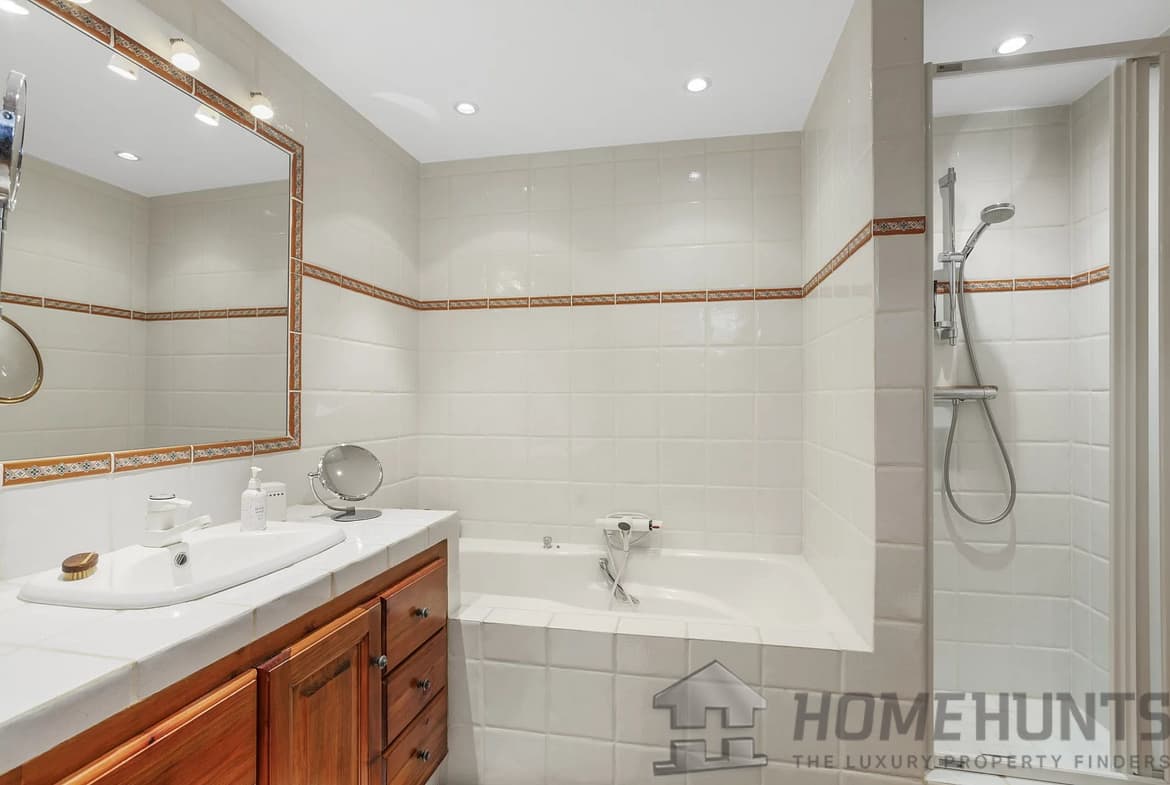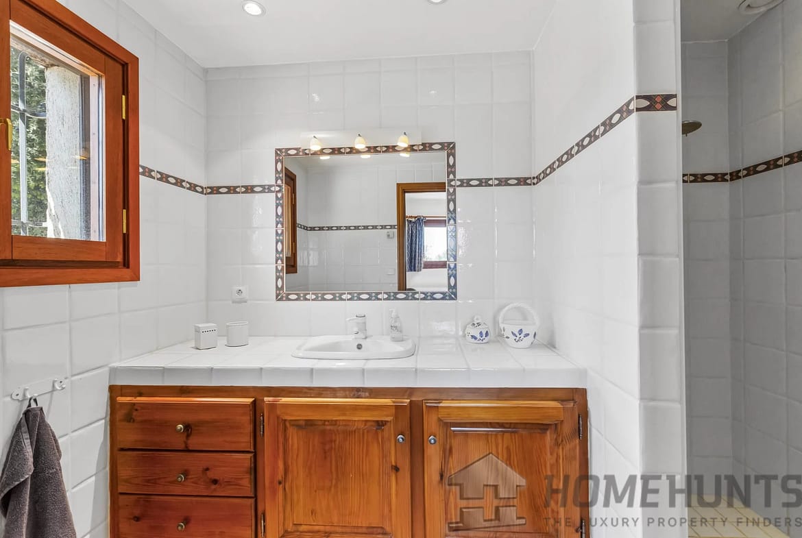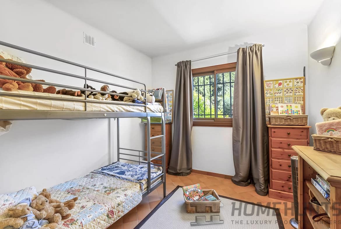 Spacious open-plan living room with dining and sitting areas, featuring large sliding doors opening directly onto the garden and pool area. A modern, fully equipped kitchen provides direct access to a cosy and covered terrace with BBQ. This level also includes the master bedroom with en-suite bathroom and toilet, a laundry room, a wine cellar and a guest toilet.