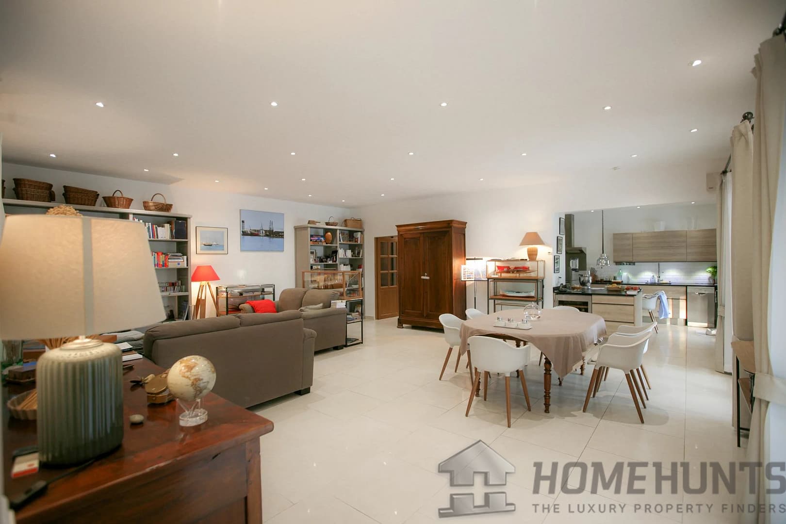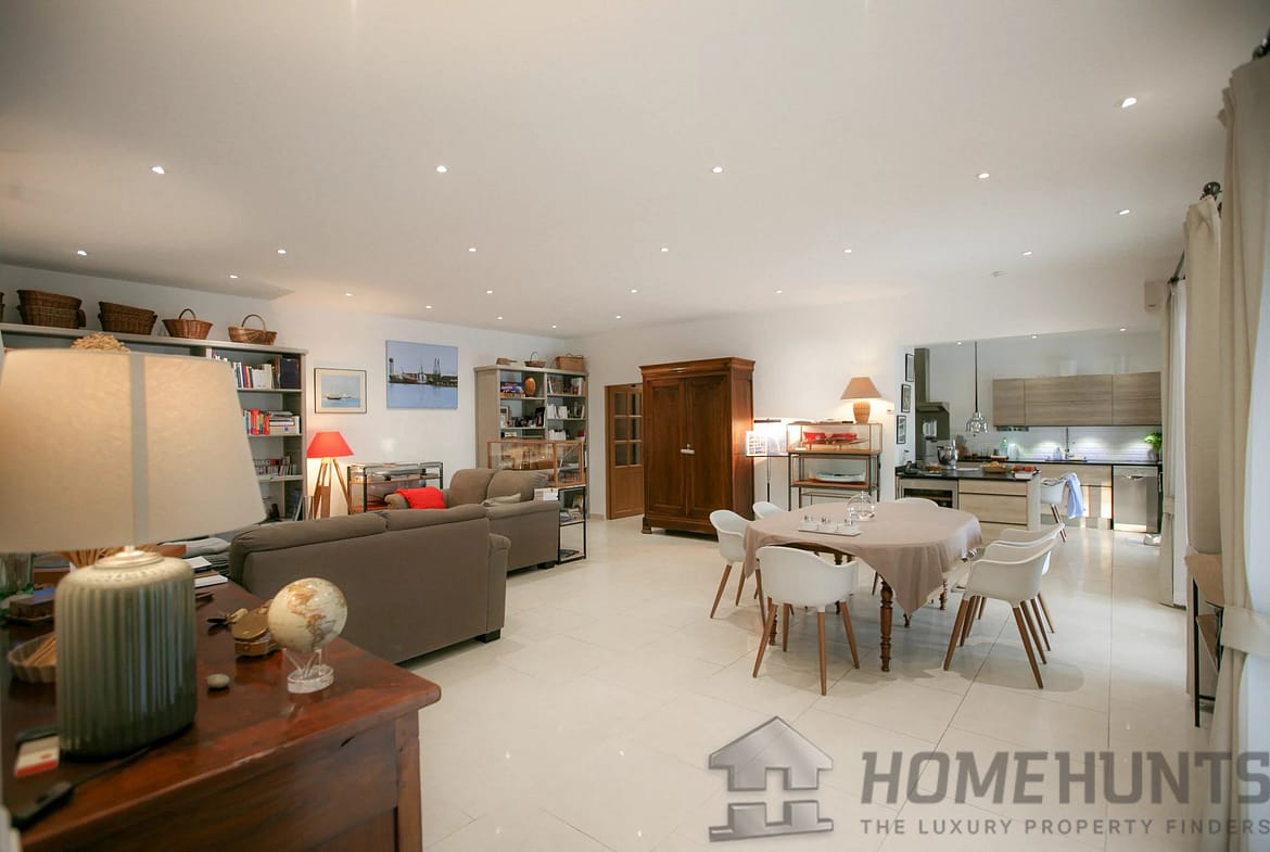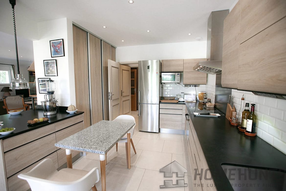 The other wing (east) has a large living room (which could be converted into a 4-bedroom suite if required) with 3 bedrooms, 3 shower rooms and 3 separate bathrooms. This area could also be used as a guest room. The house is equipped with modern home automation, underfloor heating/cooling using a heat pump, triple-glazed argon windows, acoustic partitions and acoustic doors to ensure privacy.