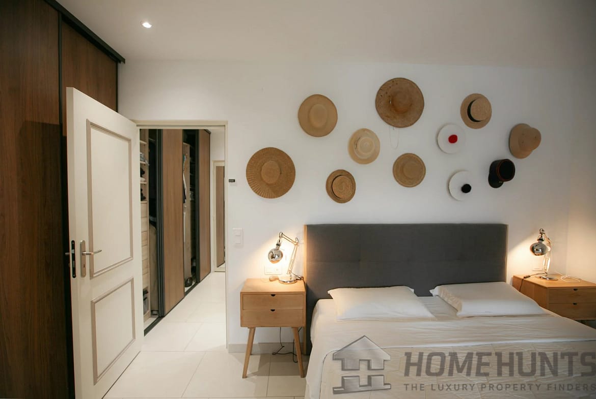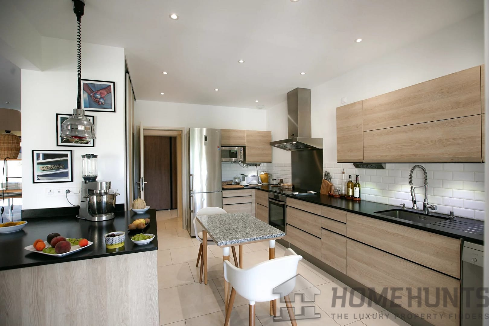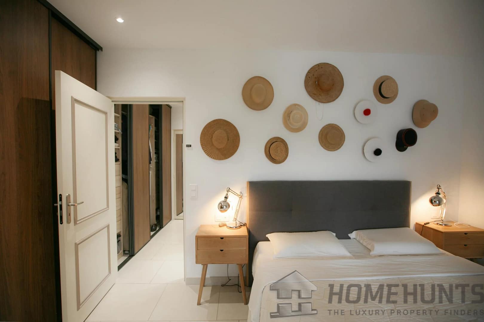 The other wing (east) has a large living room (which could be converted into a 4-bedroom suite if required) with 3 bedrooms, 3 shower rooms and 3 separate bathrooms. This area could also be used as a guest room. The house is equipped with modern home automation, underfloor heating/cooling using a heat pump, triple-glazed argon windows, acoustic partitions and acoustic doors to ensure privacy.