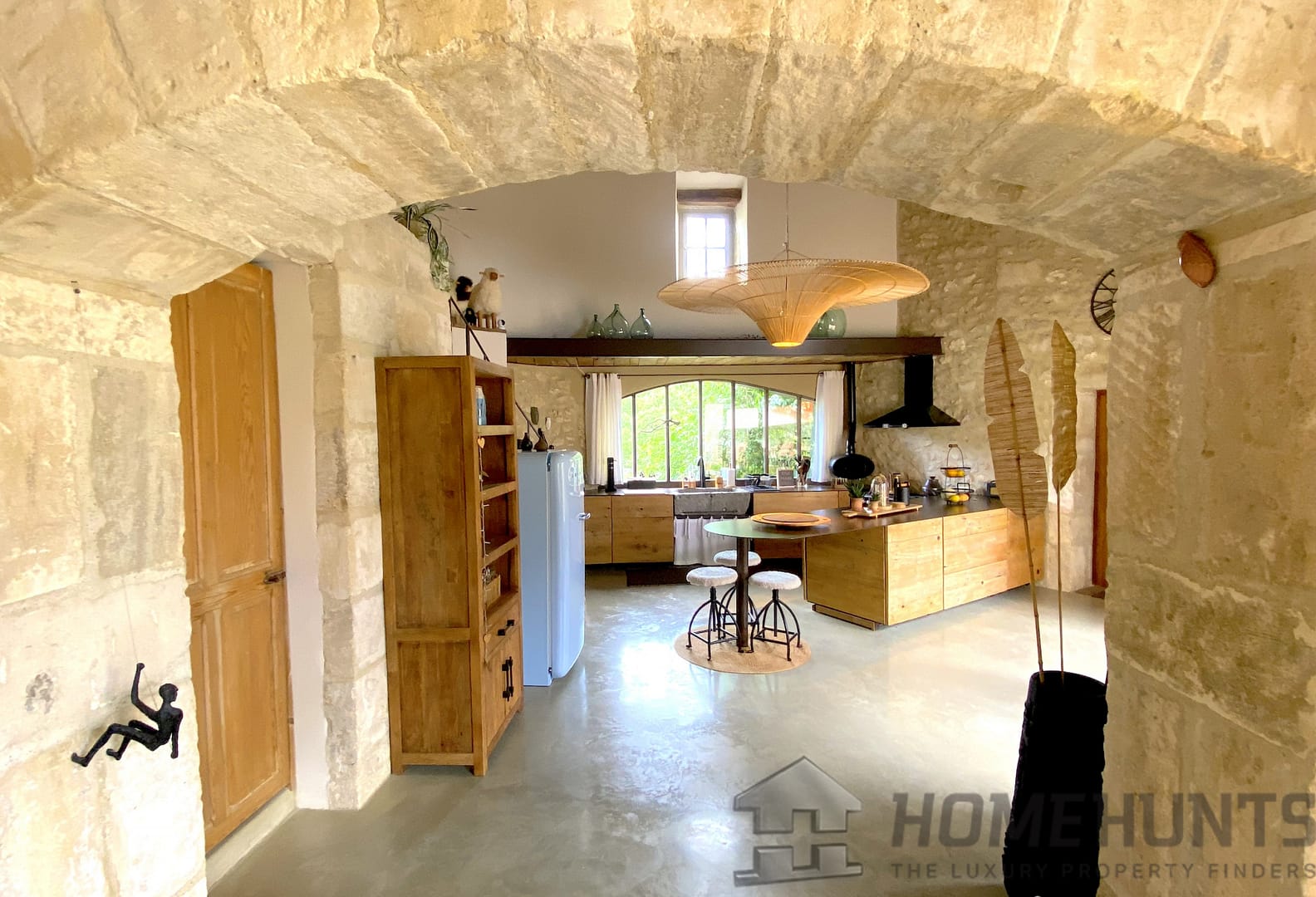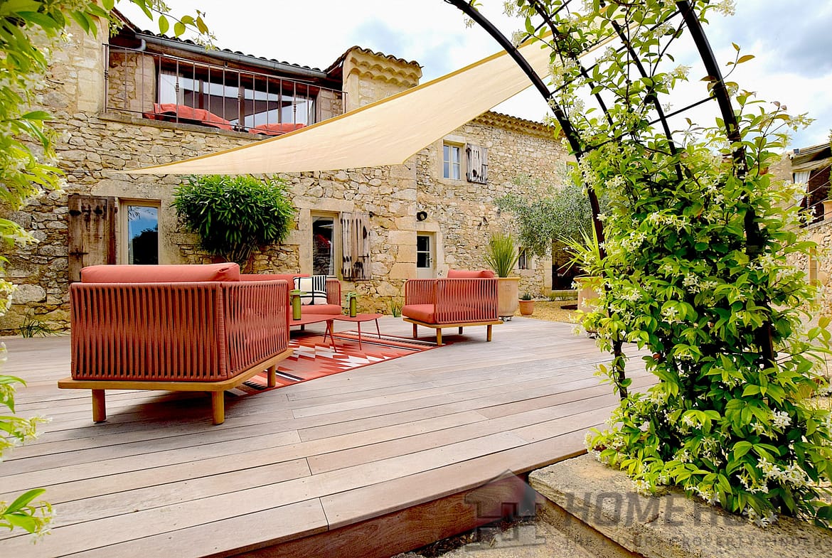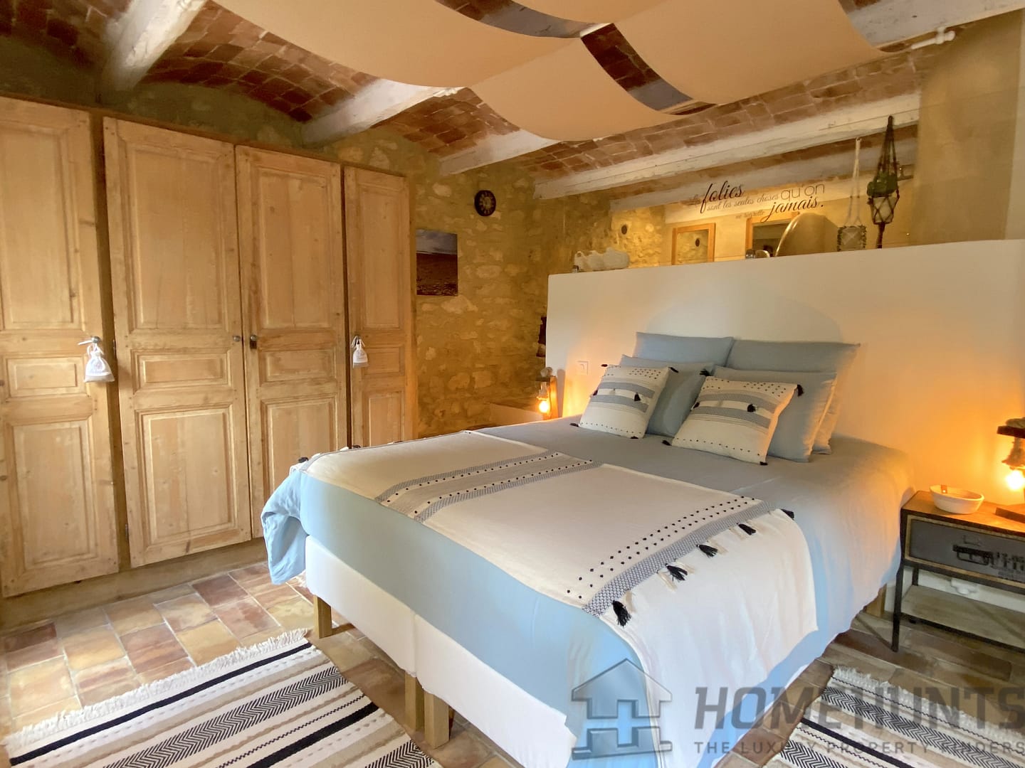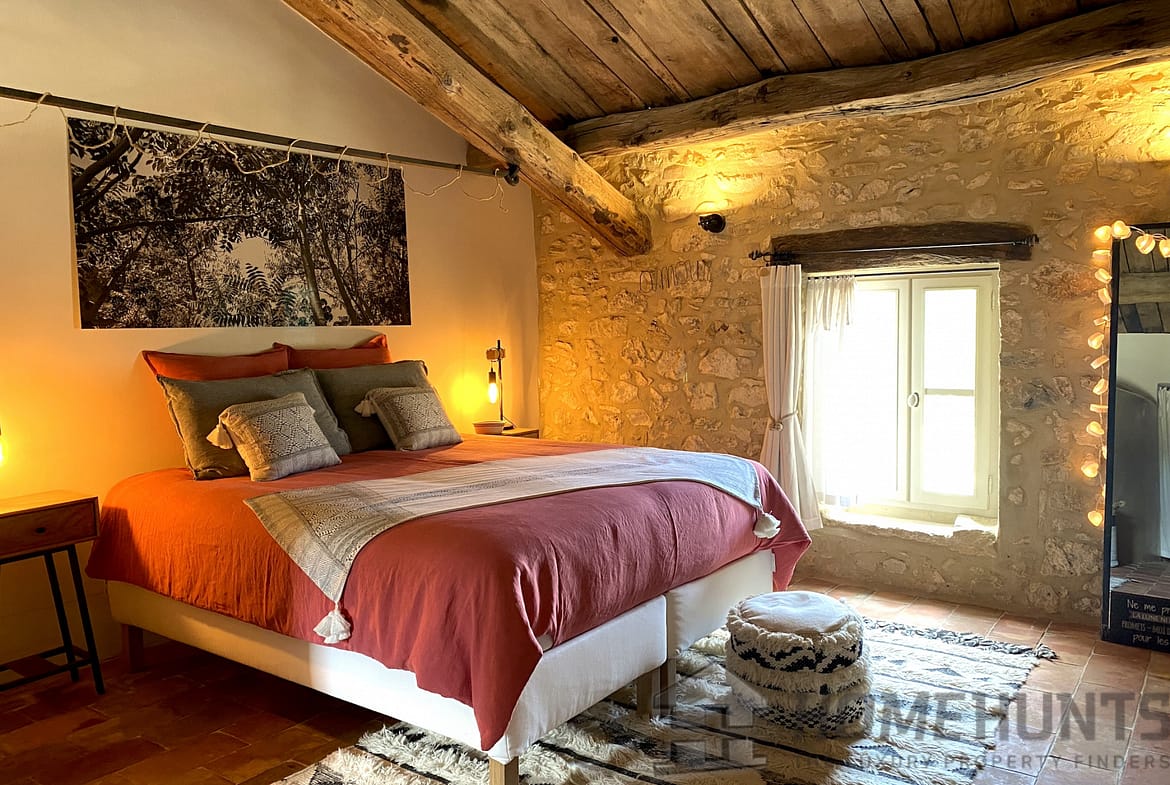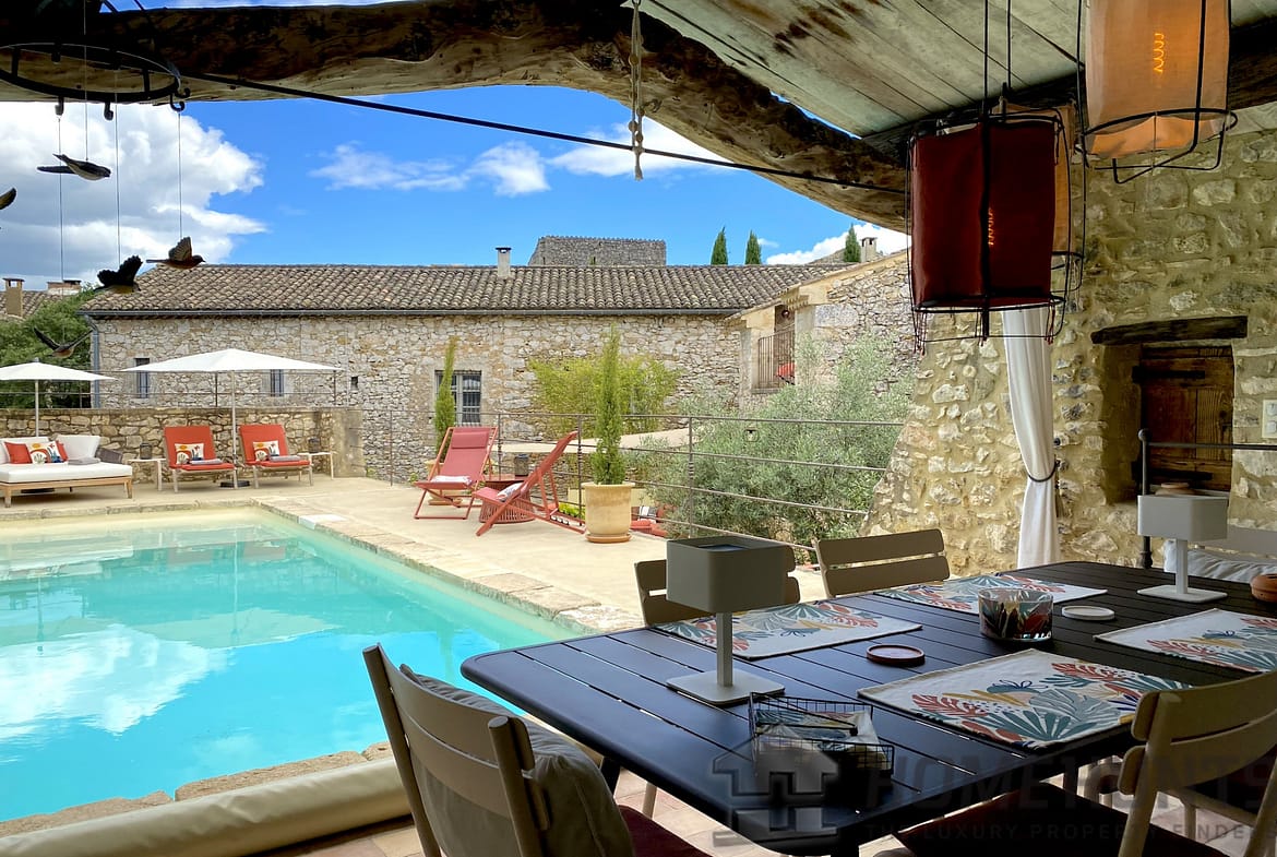 Surrounded by orchards, vineyards and lavender fields, among the lush hills of the Cèze valley, in an idyllically charming hamlet 20 k from Uzes, this old stone village house has been superbly renovated to a very high standard.