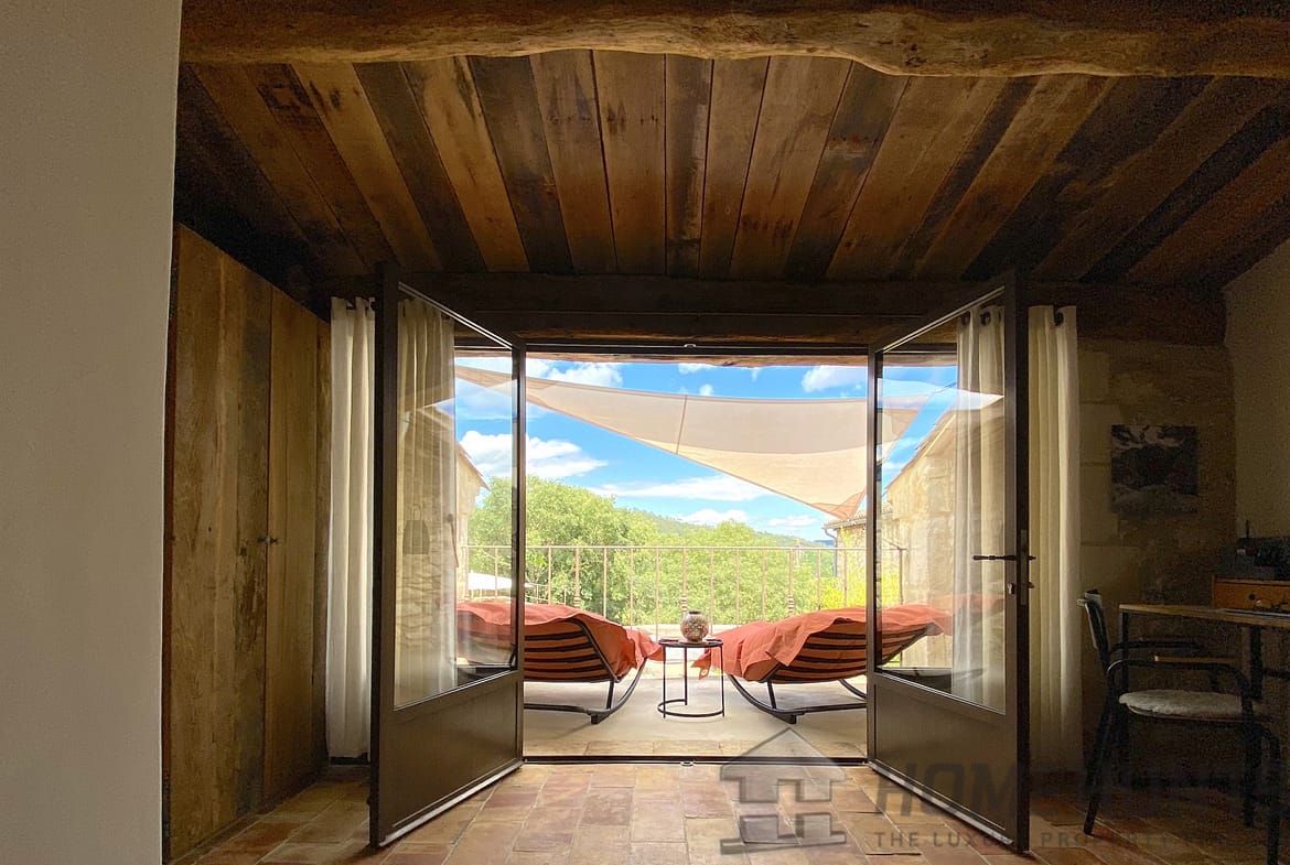 The 82 m2 living room has a great feeling of space and light ; to one side the cosy fireplace sitting room, to the other the beautifully fitted kitchen. Its cathedral ceiling, clad in reclaimed woodwork, further enhances the feeling of volume and space.