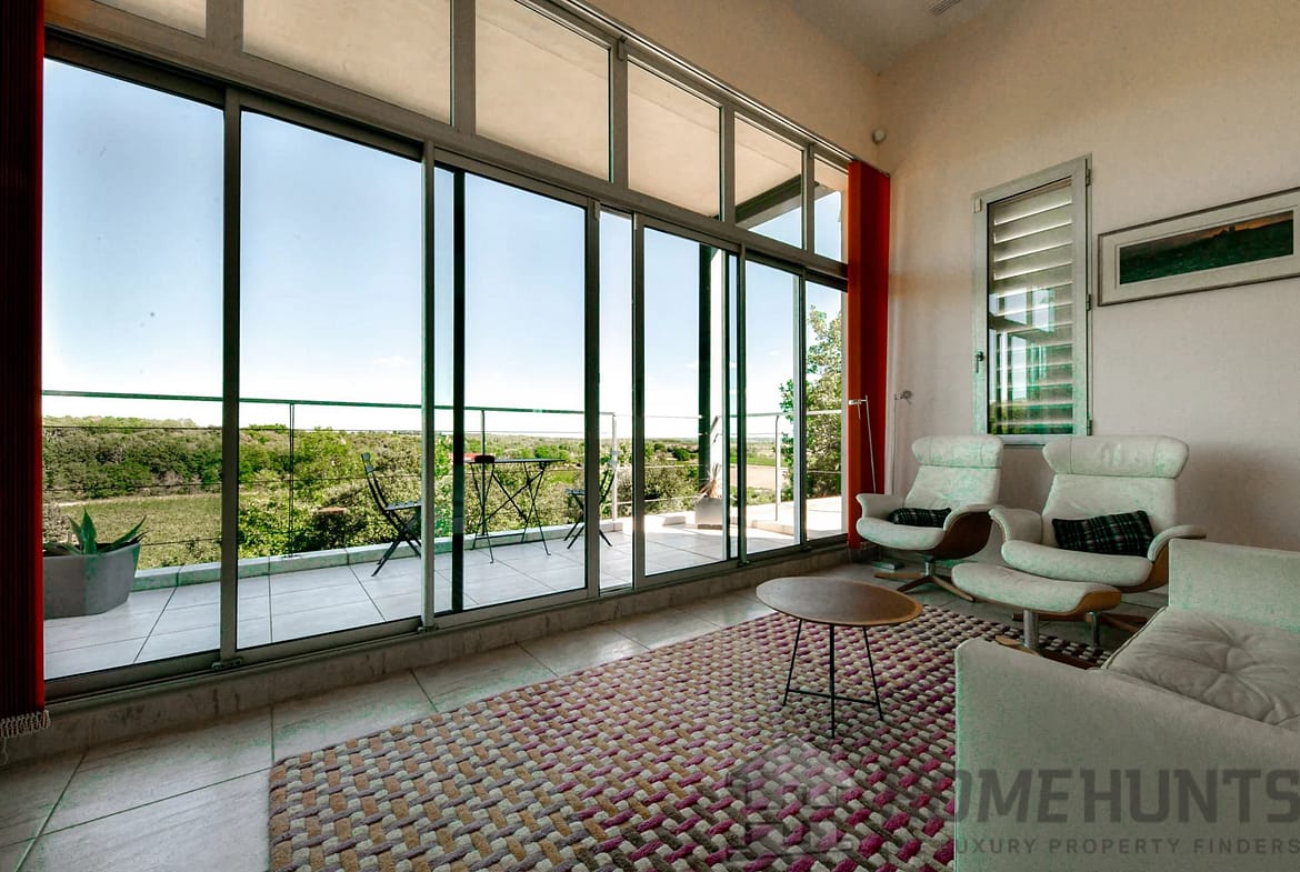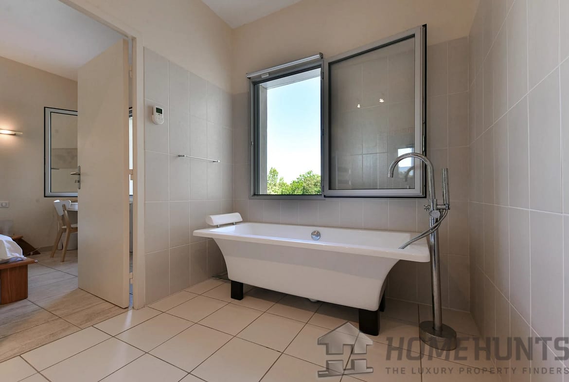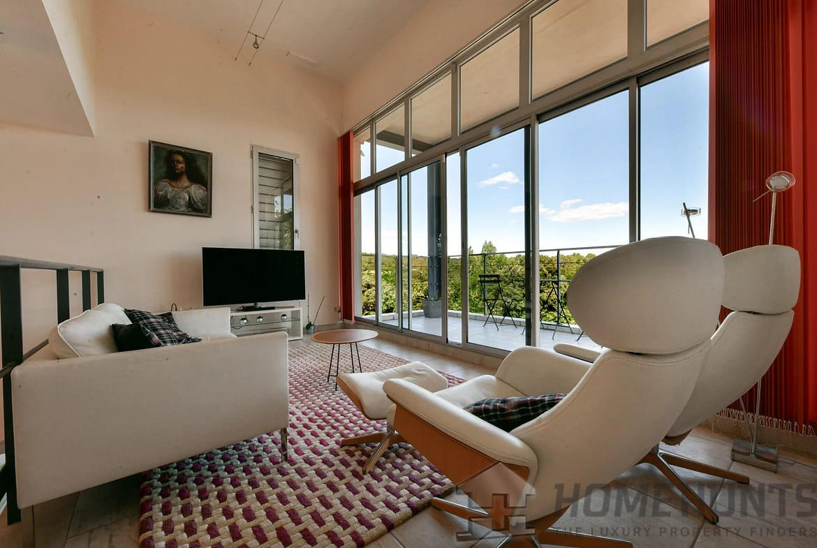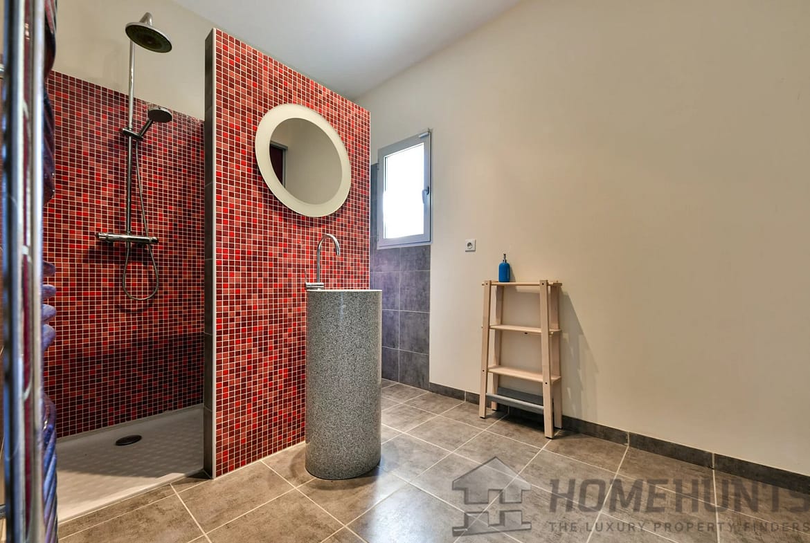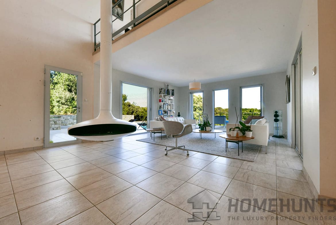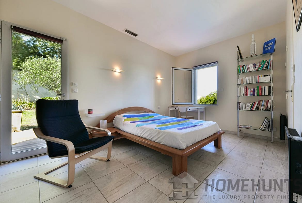 Then, a few steps further up, the television room (18 m2), partly overlooking the living room, offers spectacular views of the countryside and hills in the distance, and provides access to the property’s master suite. This spacious (33 m2) suite has a bedroom, 2 dressing rooms and bathroom (basin, walk-in shower and washbasin).