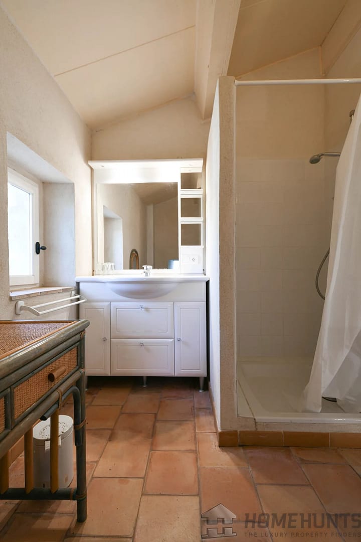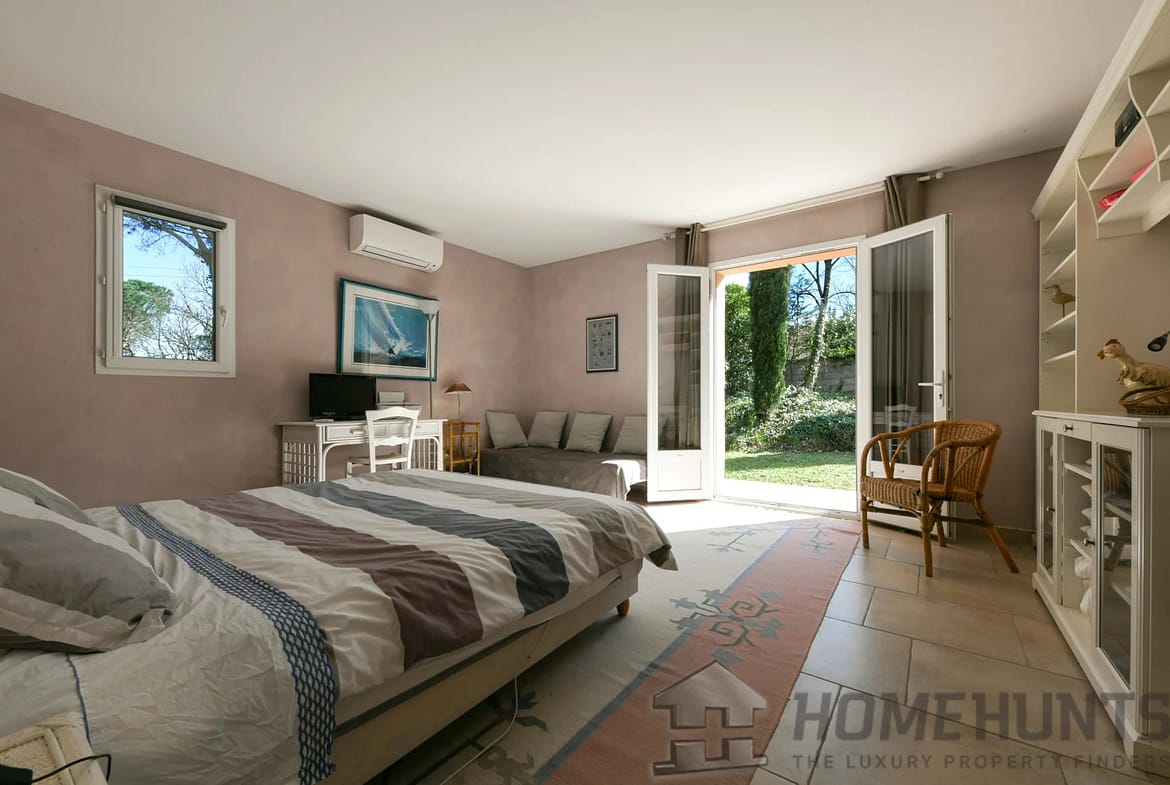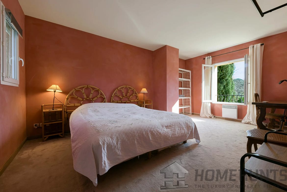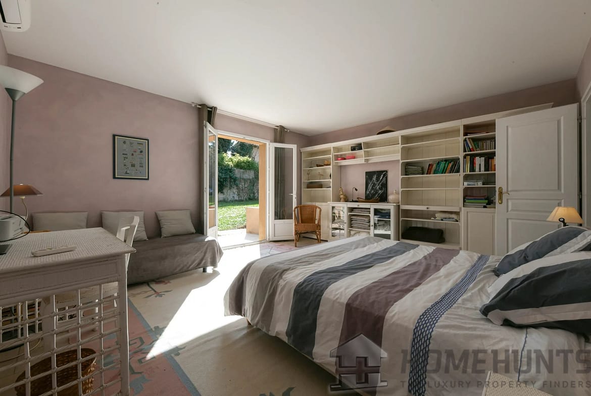 Then, a few steps lower, the property’s master suite offers a spacious bedroom, bathroom (bathtub, shower, sink, and toilet), and a dressing area. Facing south, the bedroom benefits from a private terrace. This suite covers 36m2.