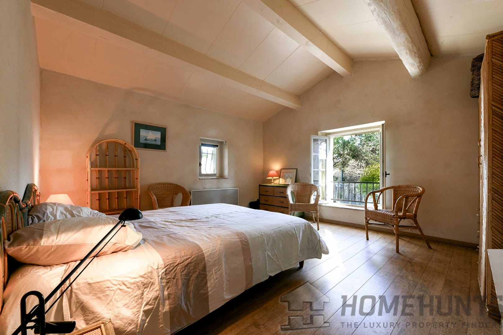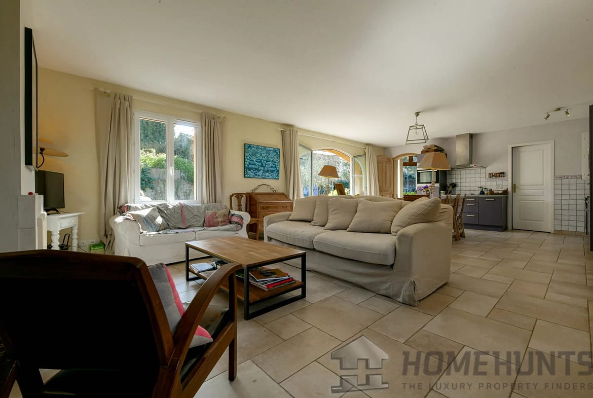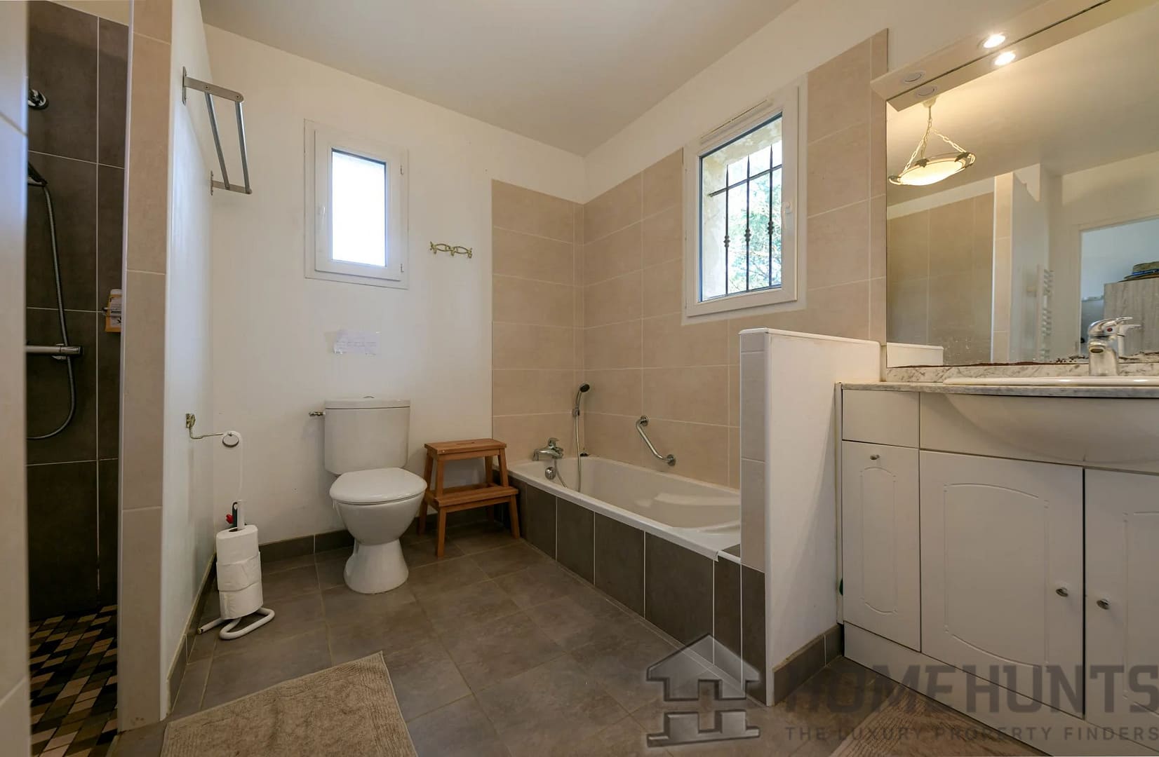 Then, a few steps lower, the property’s master suite offers a spacious bedroom, bathroom (bathtub, shower, sink, and toilet), and a dressing area. Facing south, the bedroom benefits from a private terrace. This suite covers 36m2.