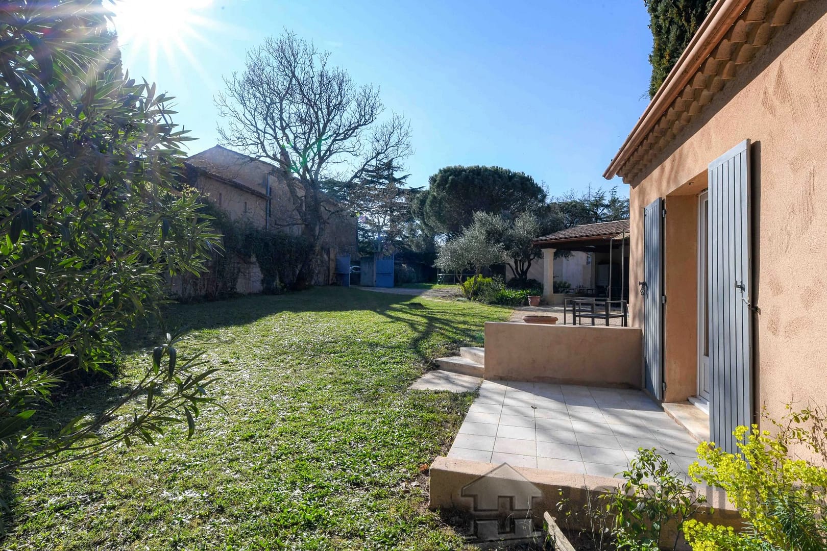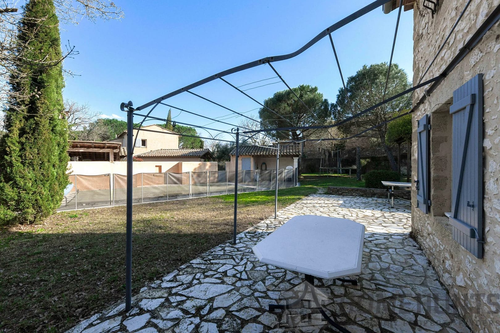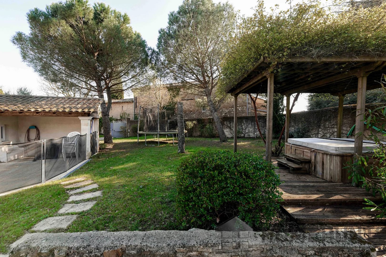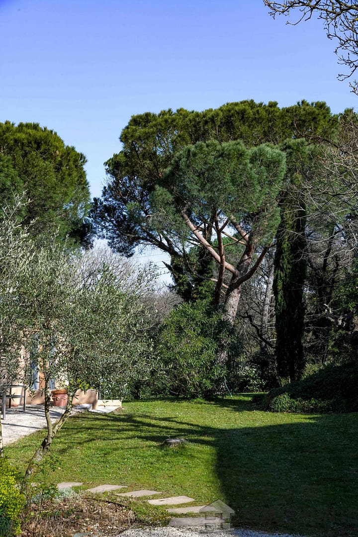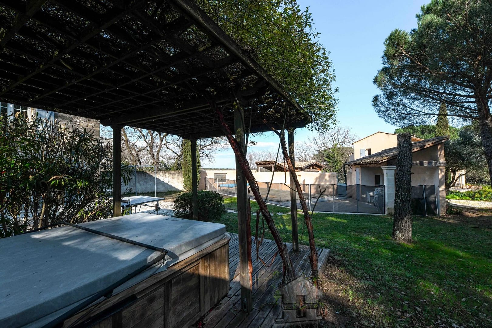 The 3,320 m2 garden offers beautiful lawns, flowerbeds, and a small wooded area, and boasts a beautiful swimming pool (8 x 4 m, chlorine filtration), complemented by a Jacuzzi area under a flowering arbor with a magnificent Lady Banks rose bush.