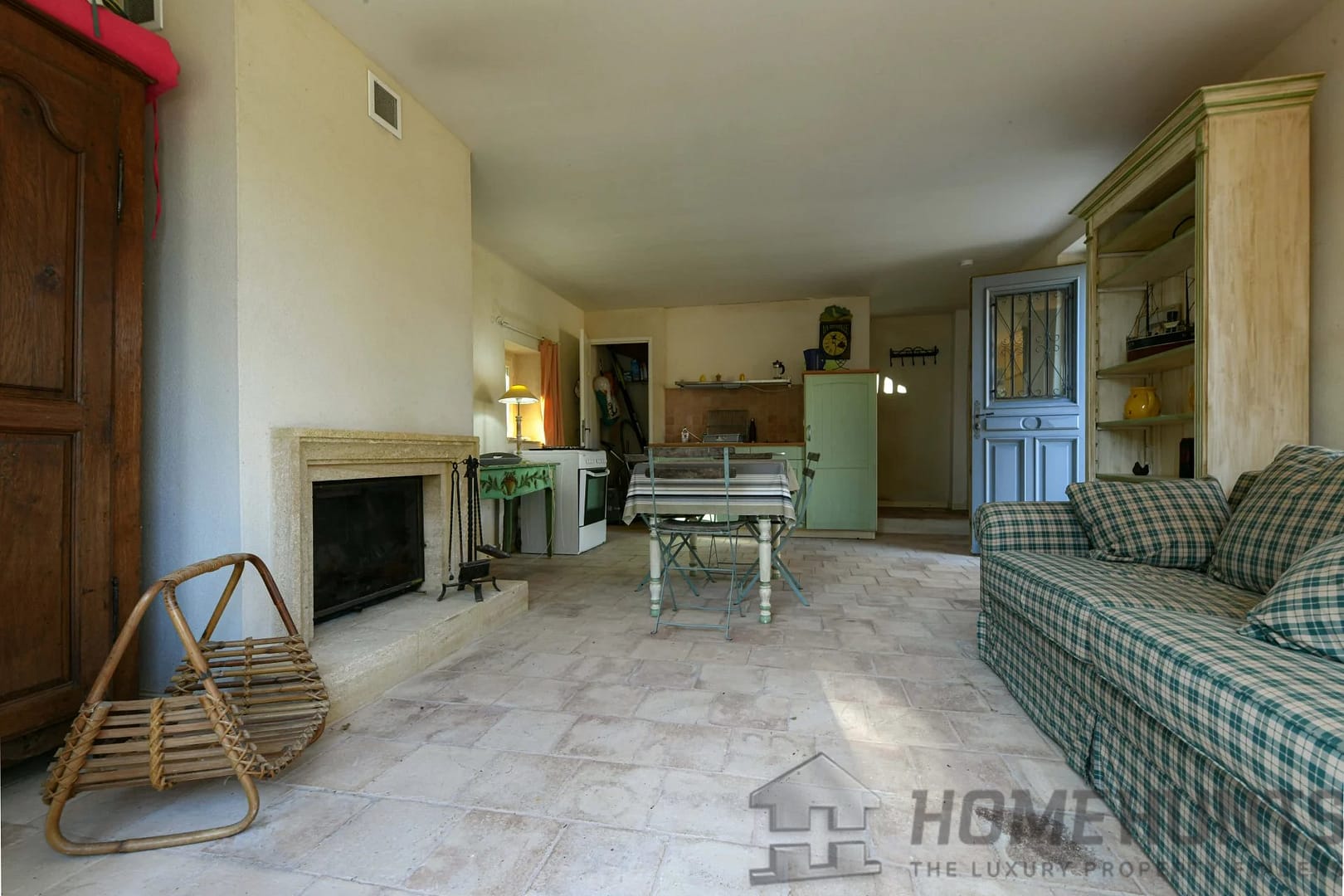 Then, on the other side of the pool area, the guest cottage (54.8m2) offers, on the ground floor, a living area with an insert fireplace and kitchenette, and on the first floor, a large bedroom with a bathroom (shower, sink, and toilet).
