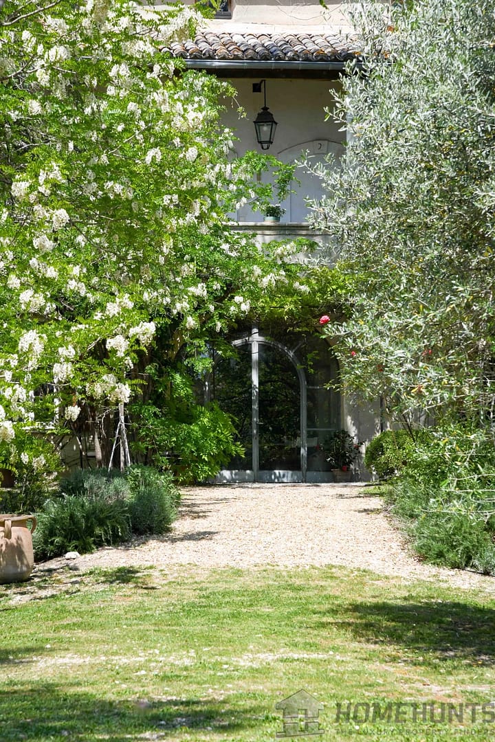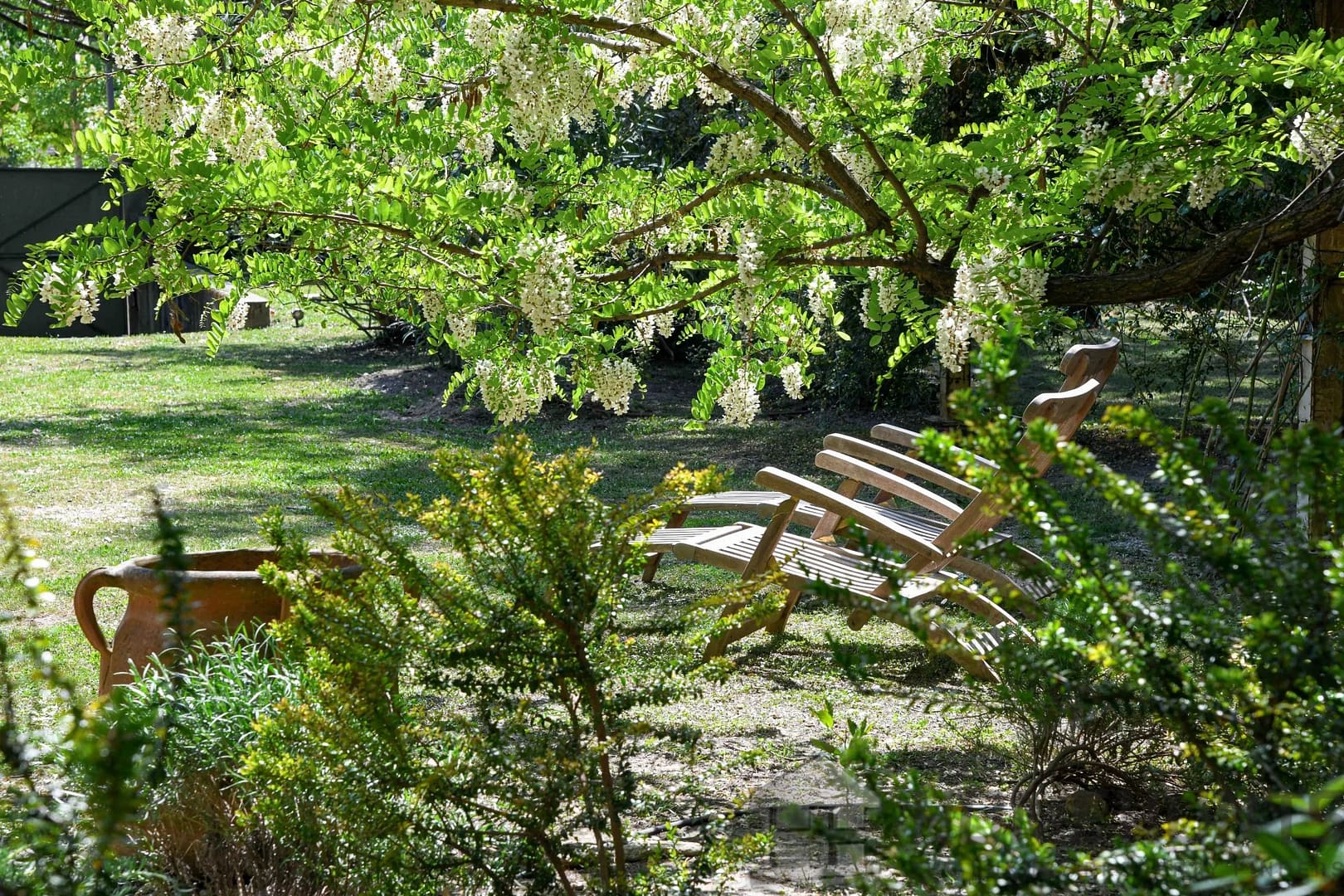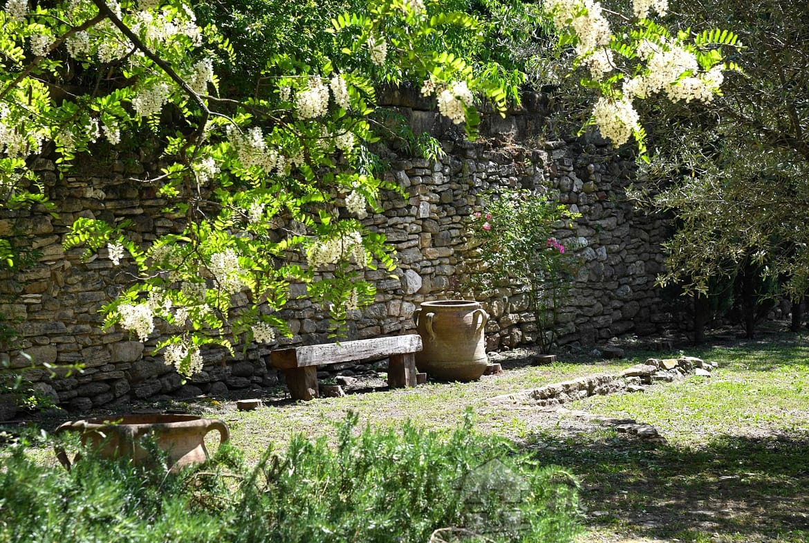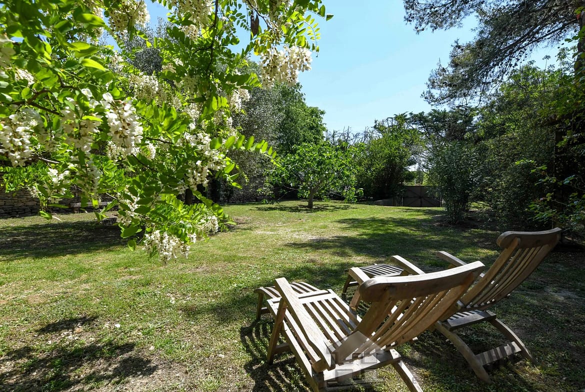 The garden (1000 m2 plot) is south-facing and planted with major trees. It is peaceful and bordered by stone walls.