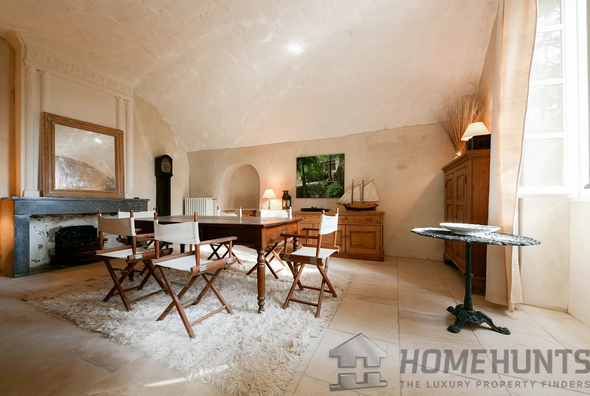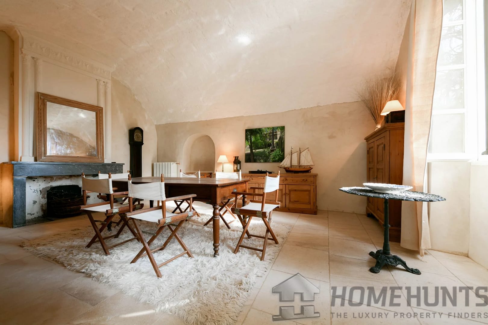 The majestic entrance hall opens onto the garden. It leads seamlessly into an intimate sitting room adorned with fine stone vaults and a vestibule with a powder room. On the garden side, there is a spacious 26 m2 dining room with a beautiful decorative fireplace and a summer kitchen, a living room featuring a barrel vault and period fireplace.