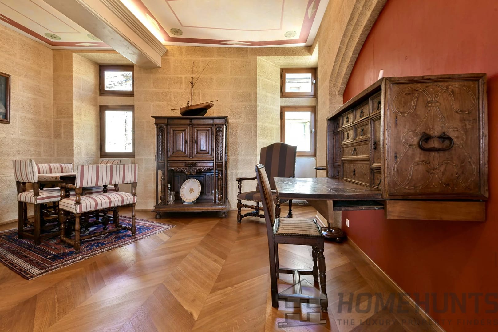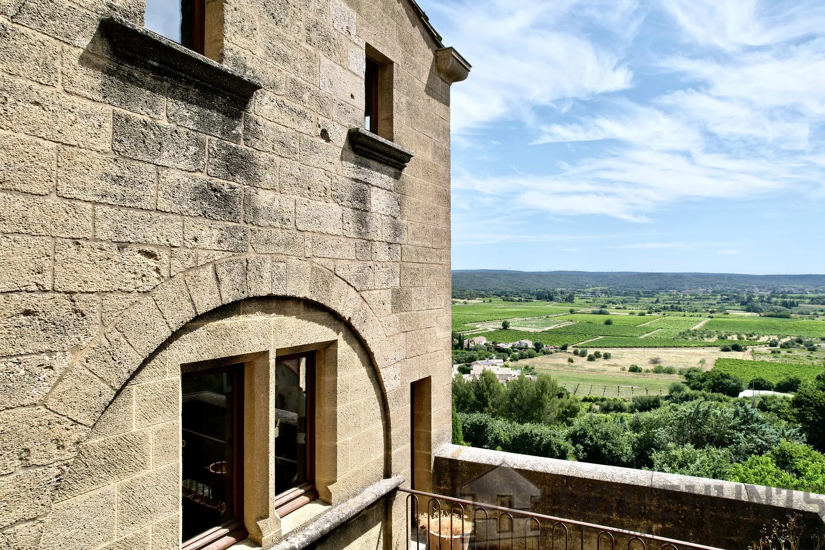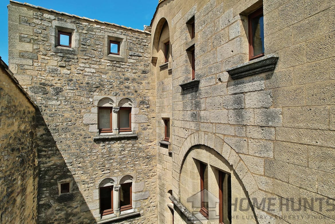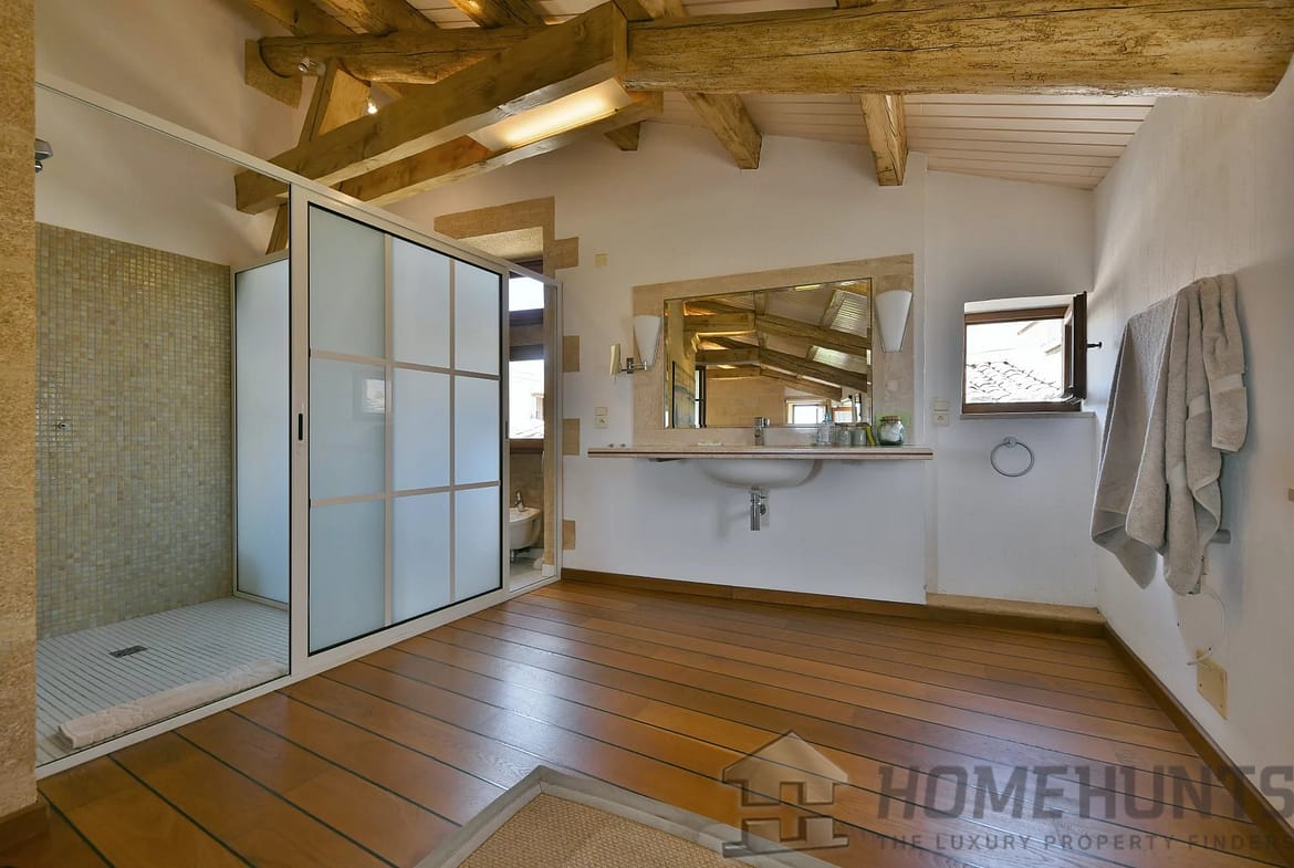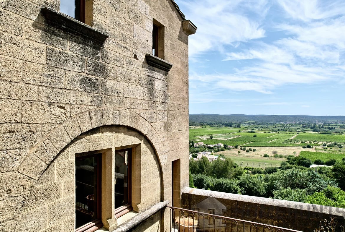 From the spiral staircase or the lift, the first floor offers a second living area. Two lounges of 43 and 25 m2 offer spacious accommodation and old-world charm: mullioned windows, ceiling beams, solid wood parquet flooring and terracotta floor tiles. Unique views over an unspoilt panorama, the landscaped courtyard, the surrounding countryside, vineyards, farmland, hills and the Alpilles. A wrap-around balcony provides a small, refreshing outdoor space from the large lounge overlooking one of the village’s ancient gateways.