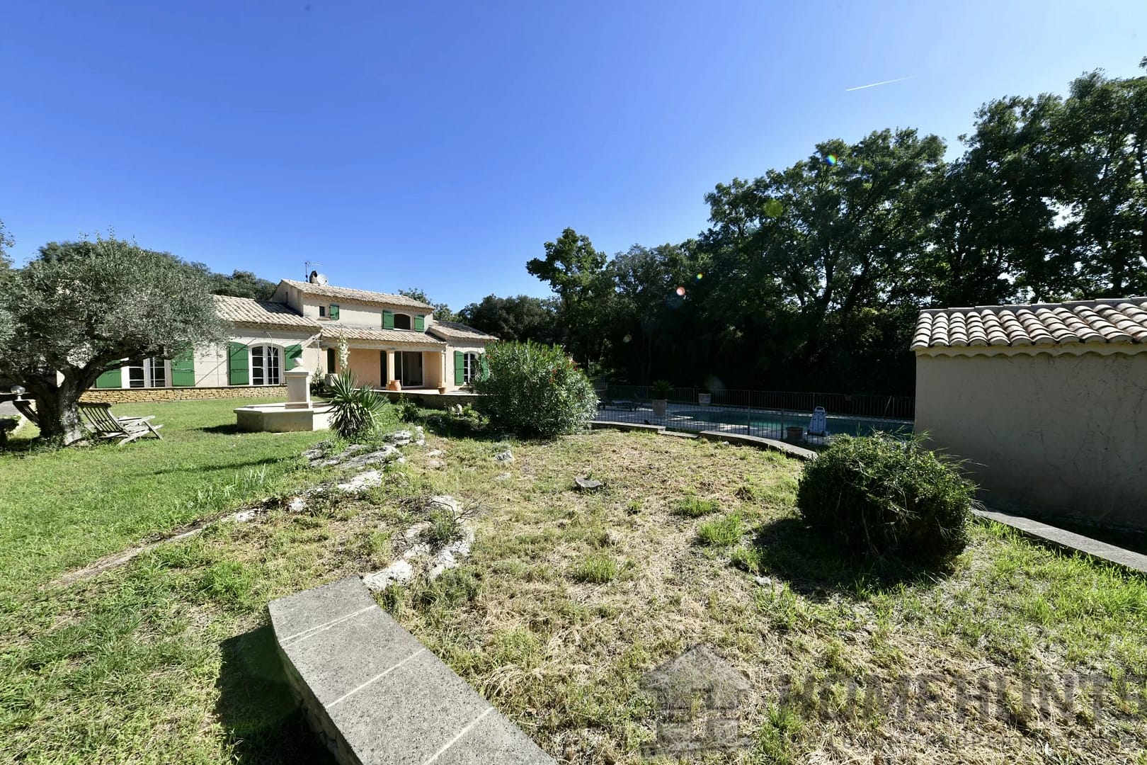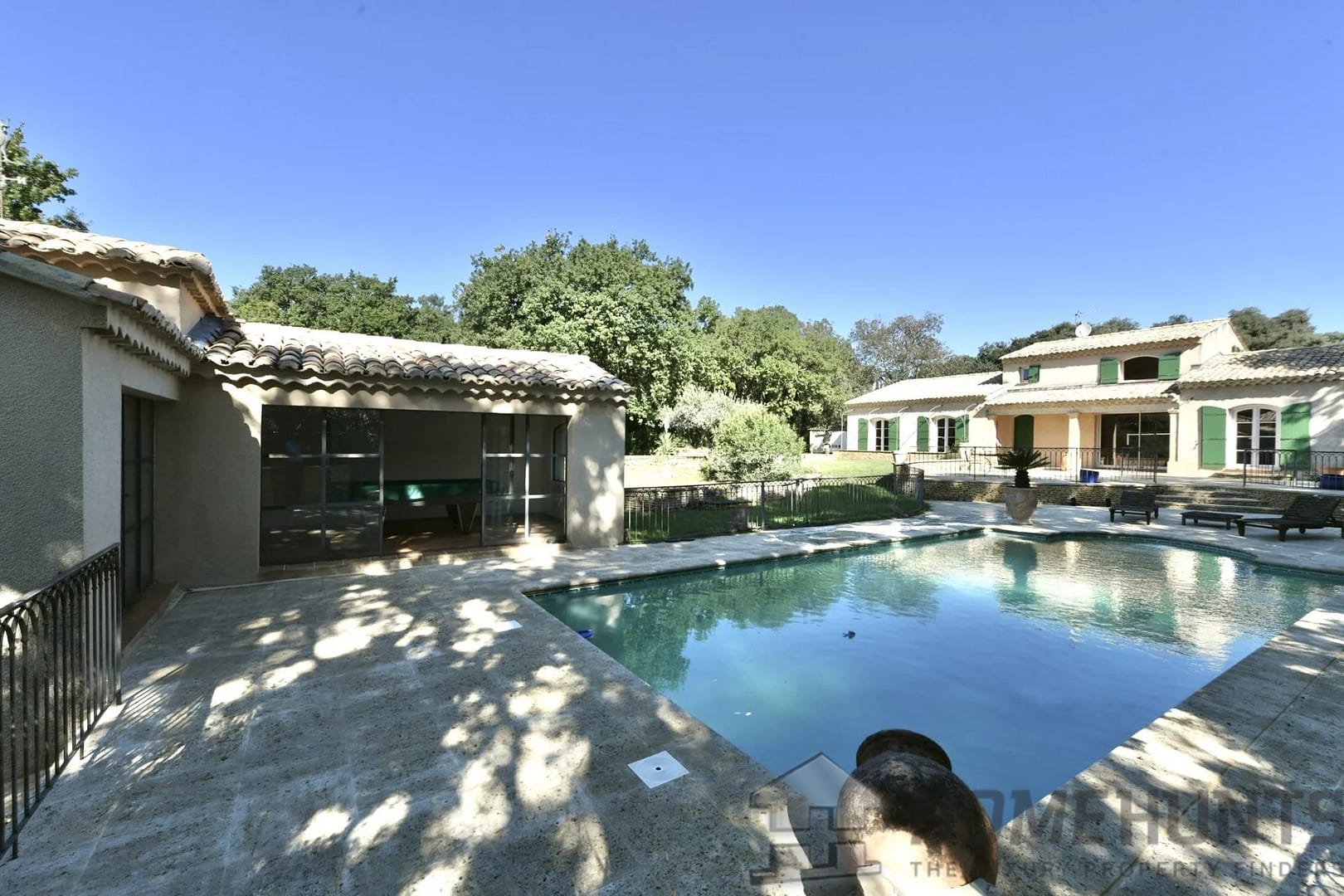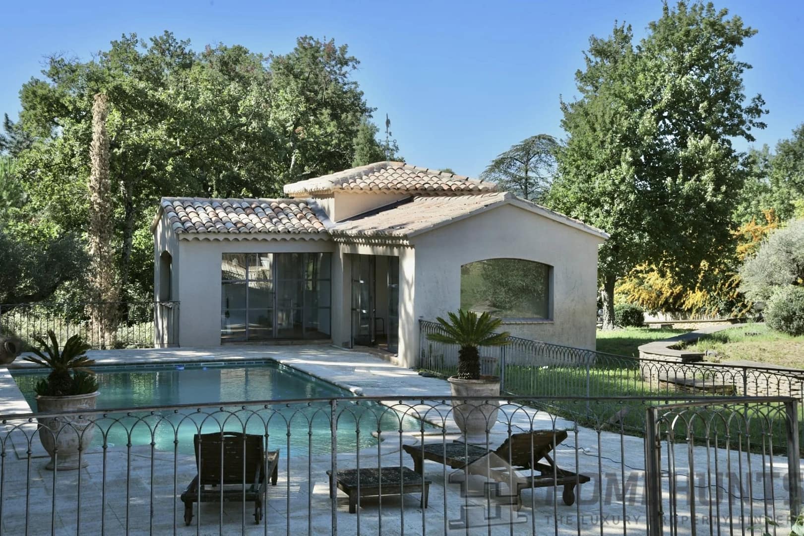 – Landscaped garden, pool, and pool house