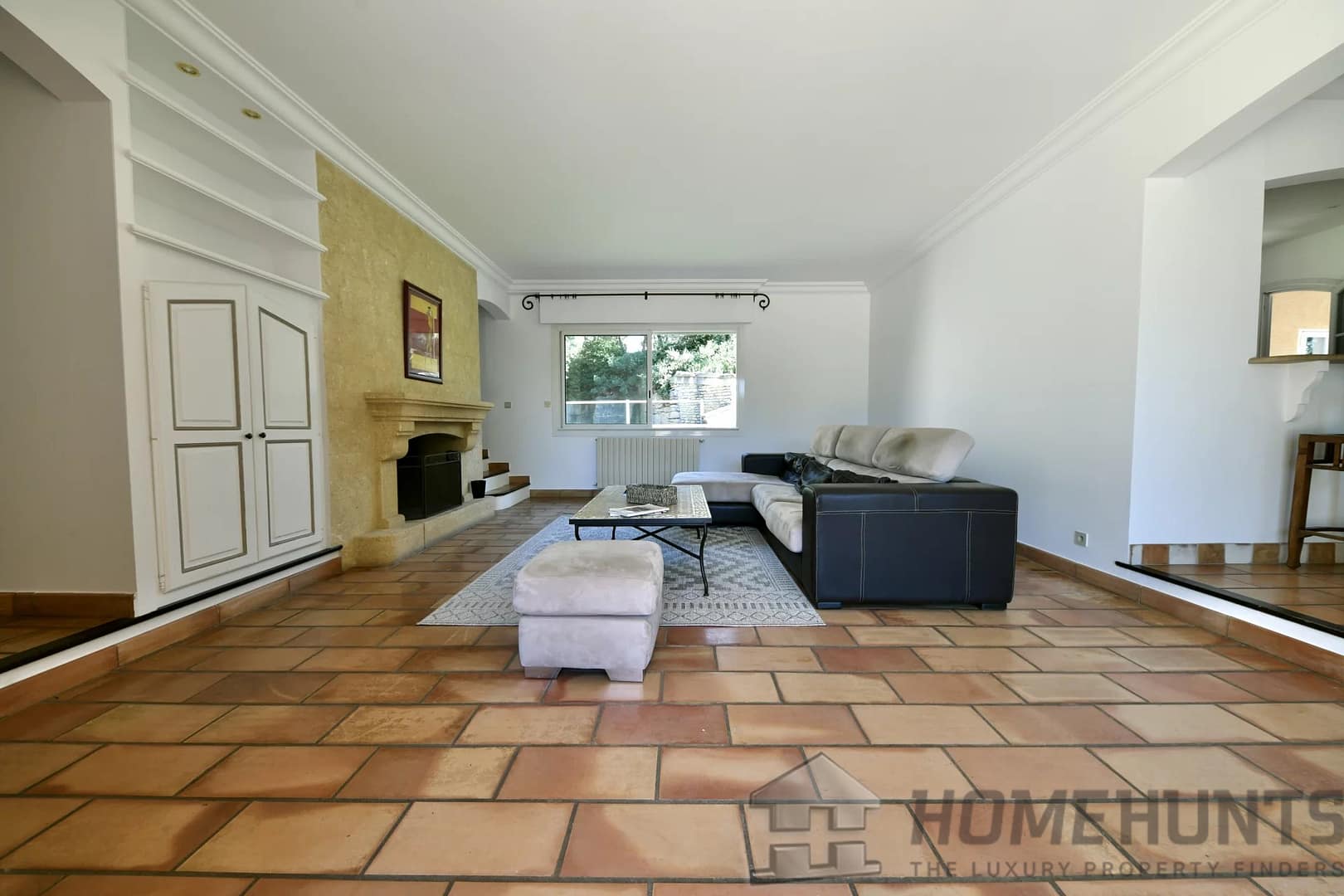 A bright living room with fireplace opening onto the garden