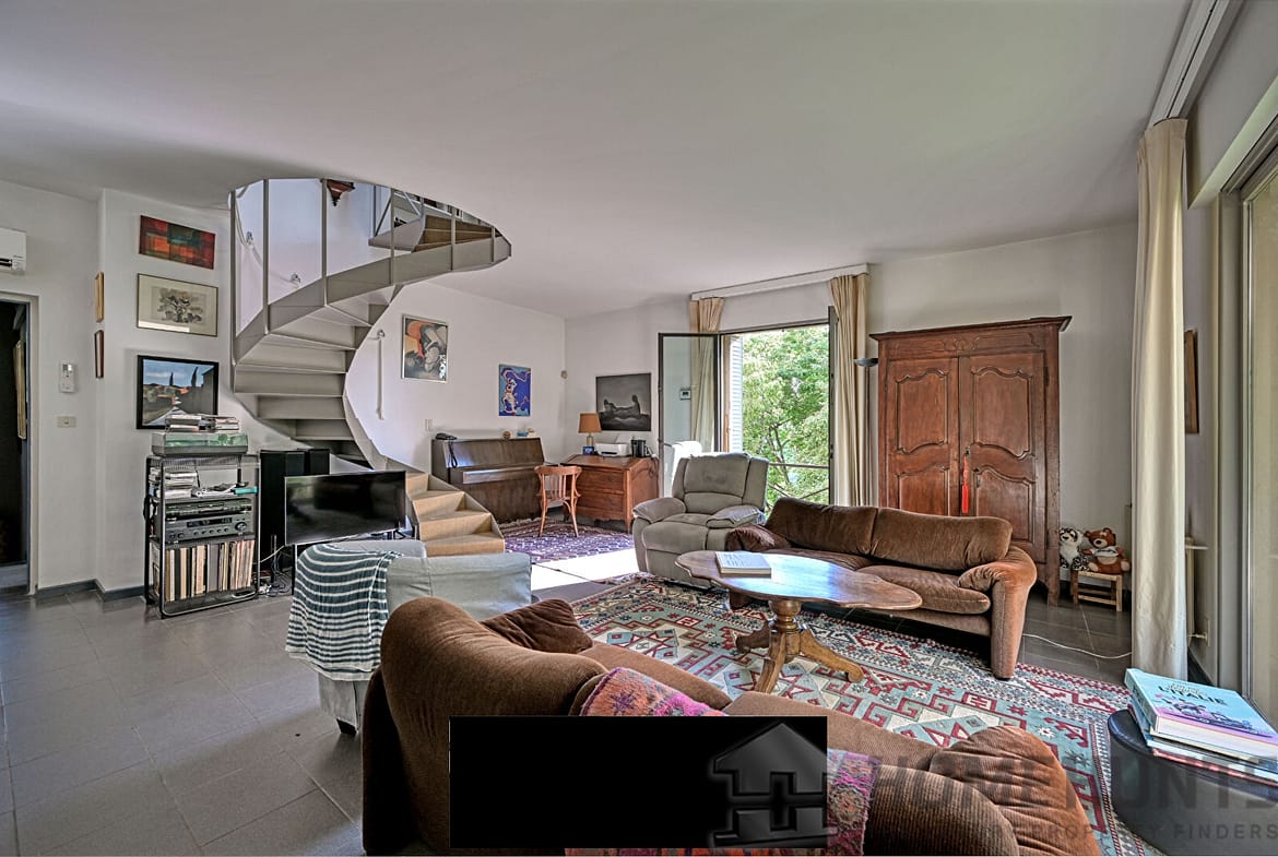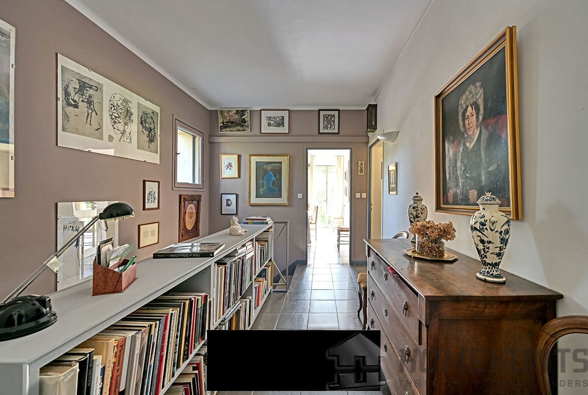 Upstairs, a second accommodation takes shape: a living room bathed in light, a separate kitchen, an intimate bedroom with direct access to a spacious terrace, and a dining room that can easily become an additional bedroom or open into a vast open space with the living room. A library with a fireplace completes this floor, like a refuge for quiet hours.