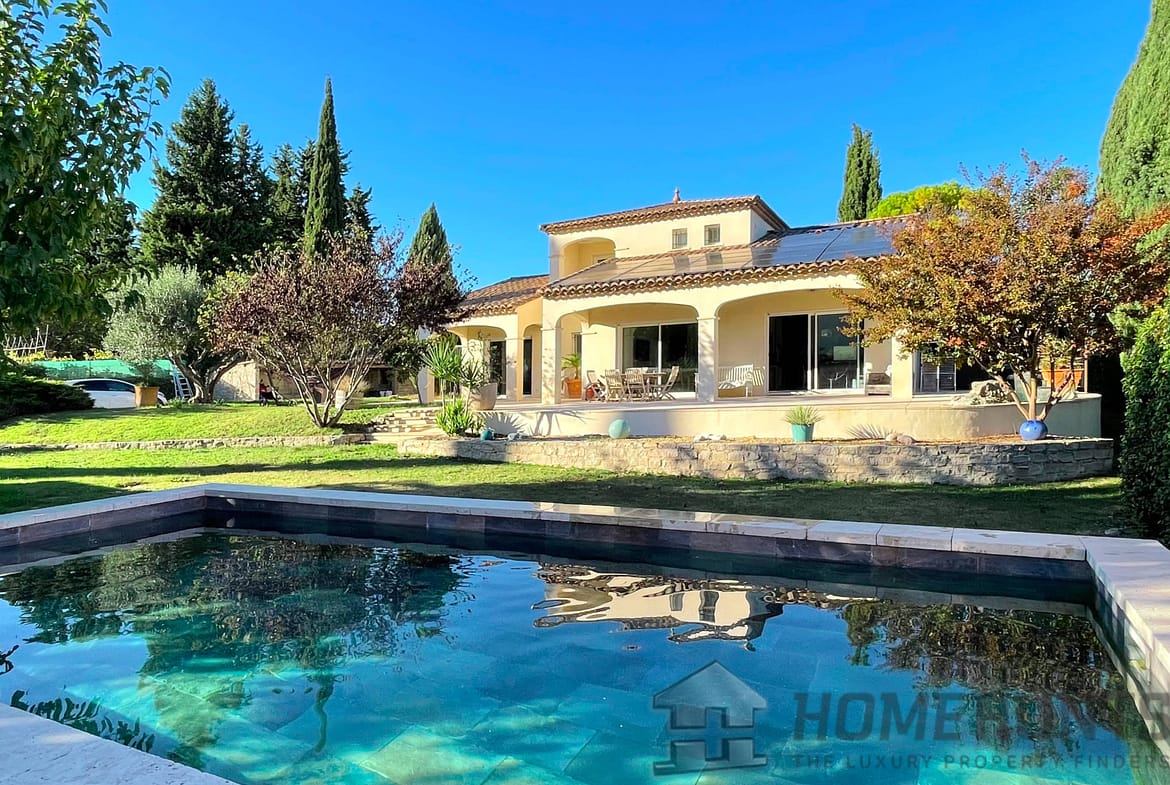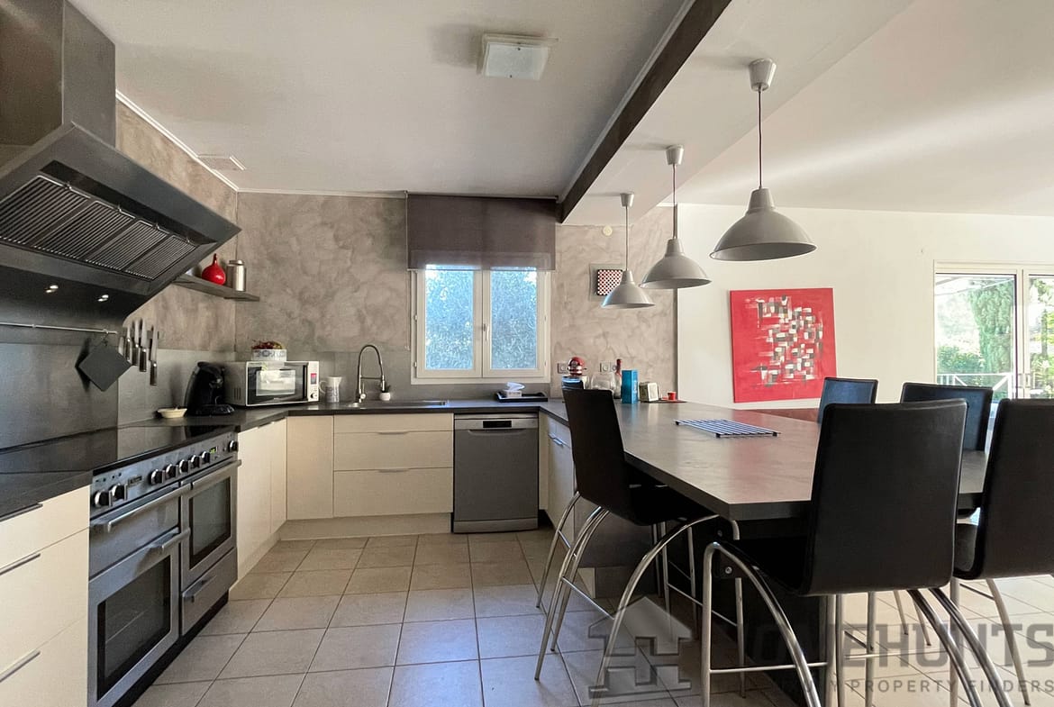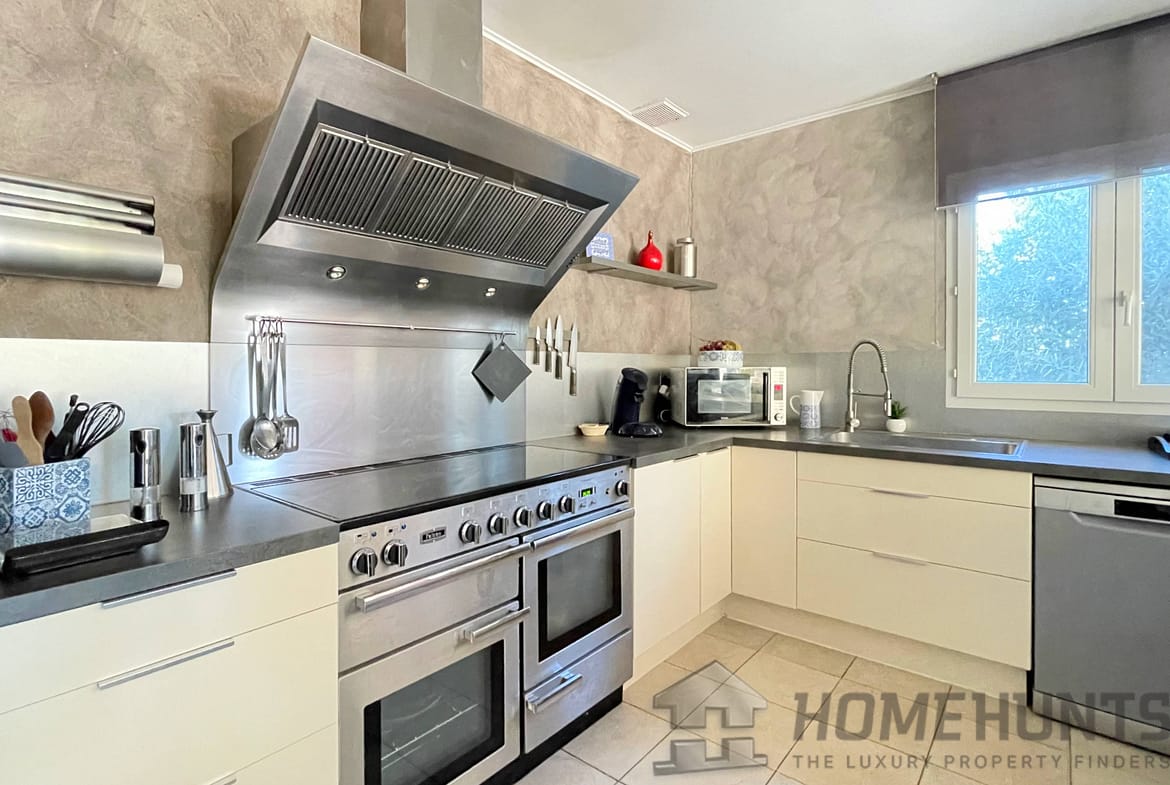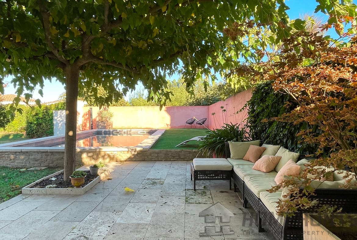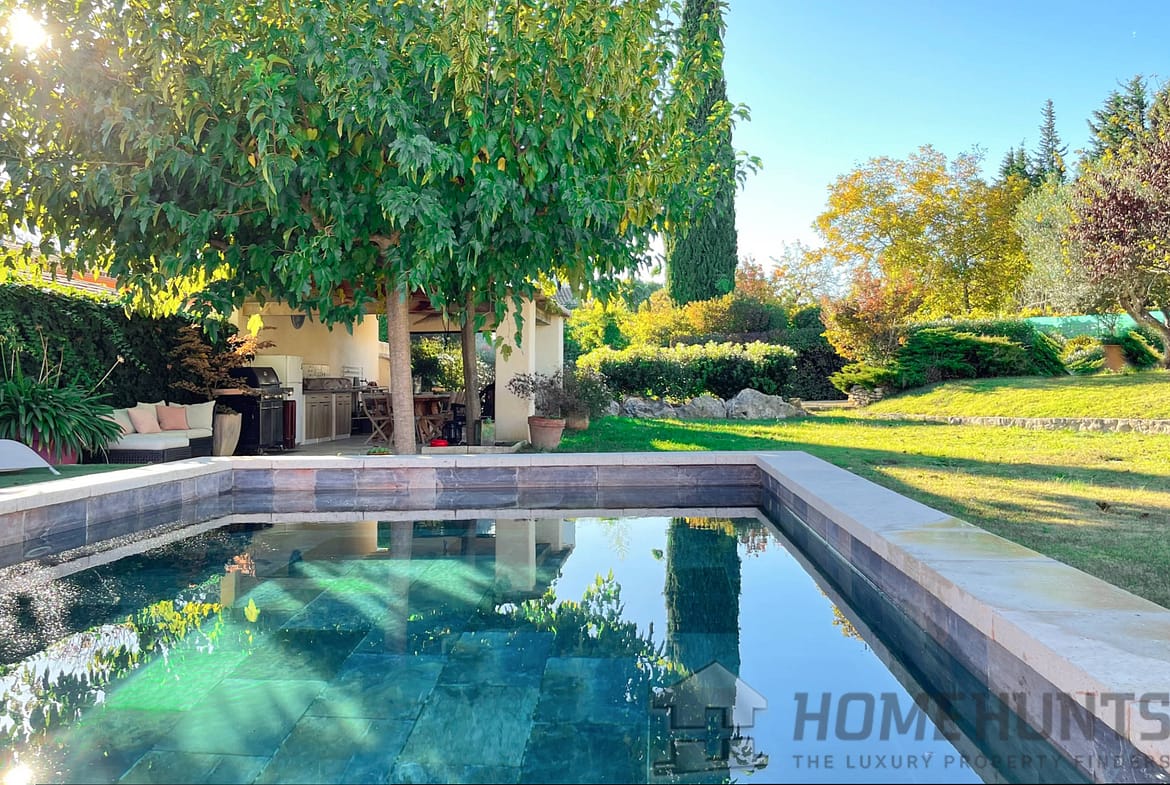 The 1,600 m2 landscaped garden, enclosed and meticulously maintained, offers a harmonious outdoor living space: an 8 x 4 m swimming pool surrounded by spacious terraces, a summer lounge, and an outdoor kitchen, all inviting relaxation and shared moments.
