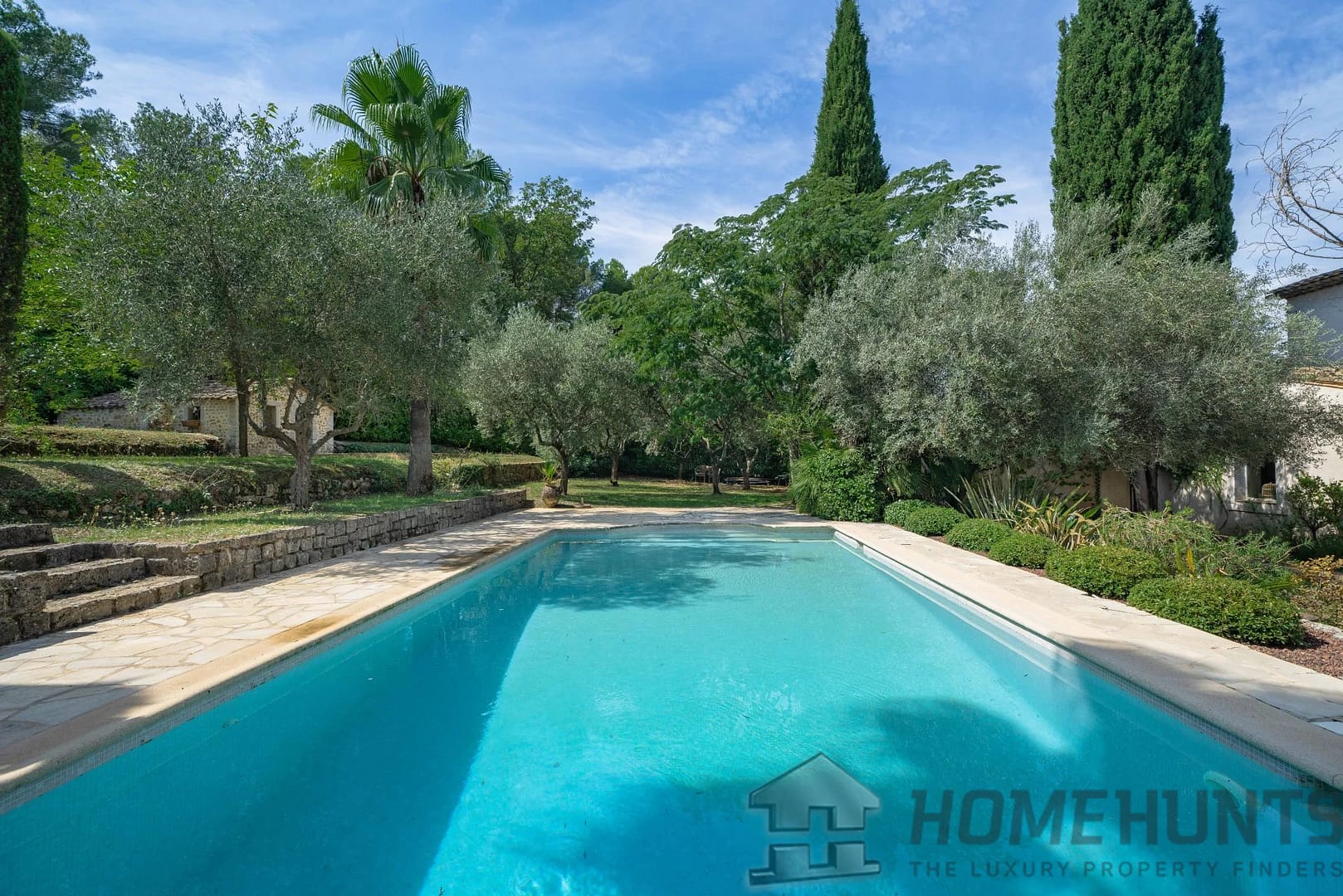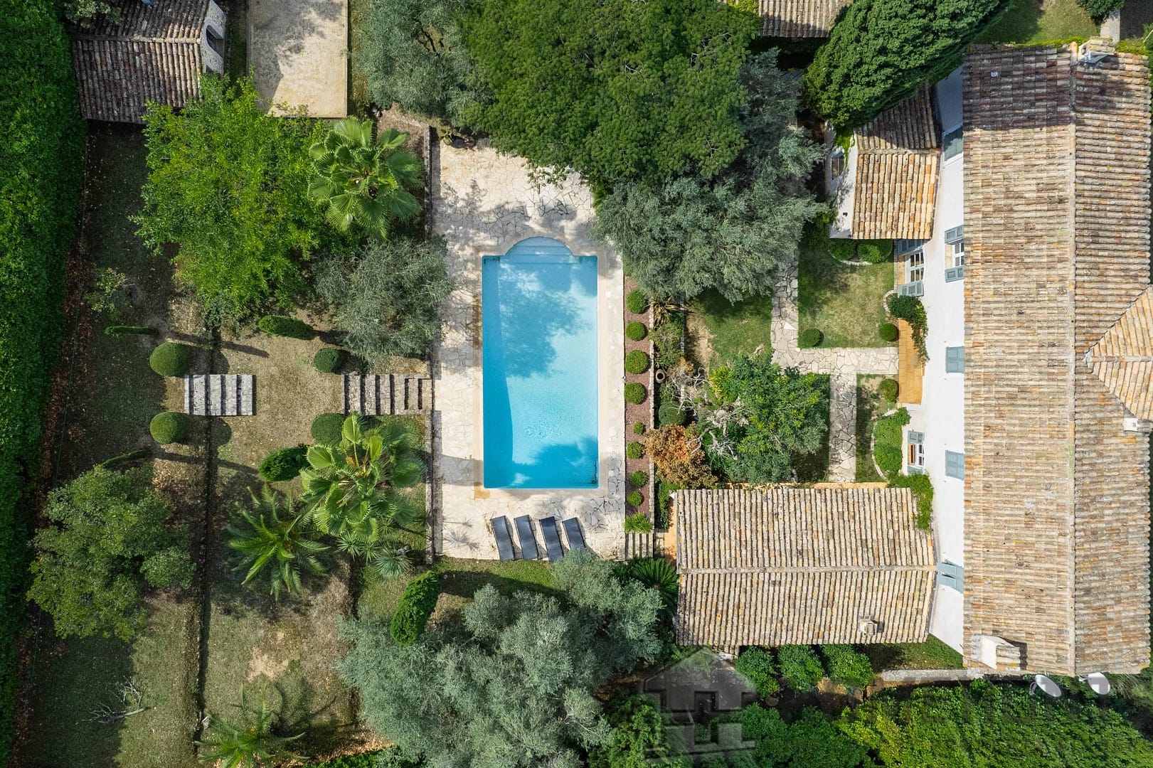 The landscaped garden, a true oasis of tranquility, is a major asset of this villa. Olive trees, palm trees, cypress trees, and various types of bushes blend perfectly with the architectural style of the property.