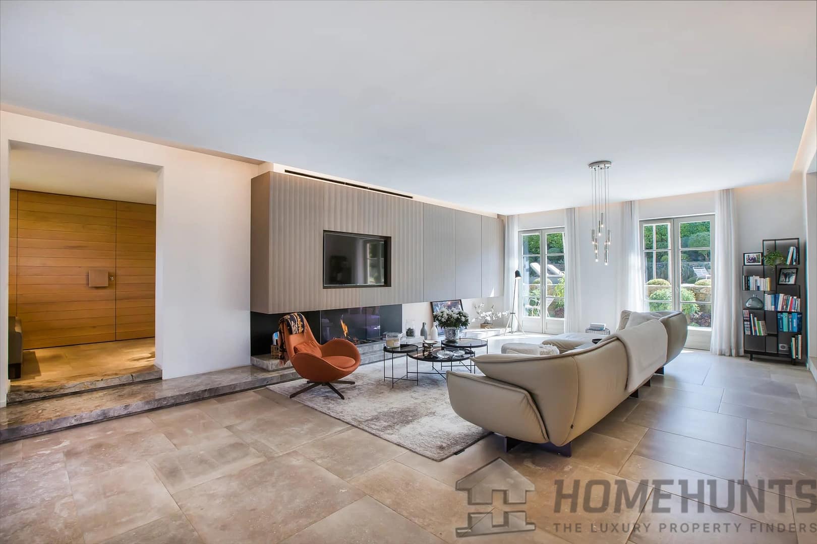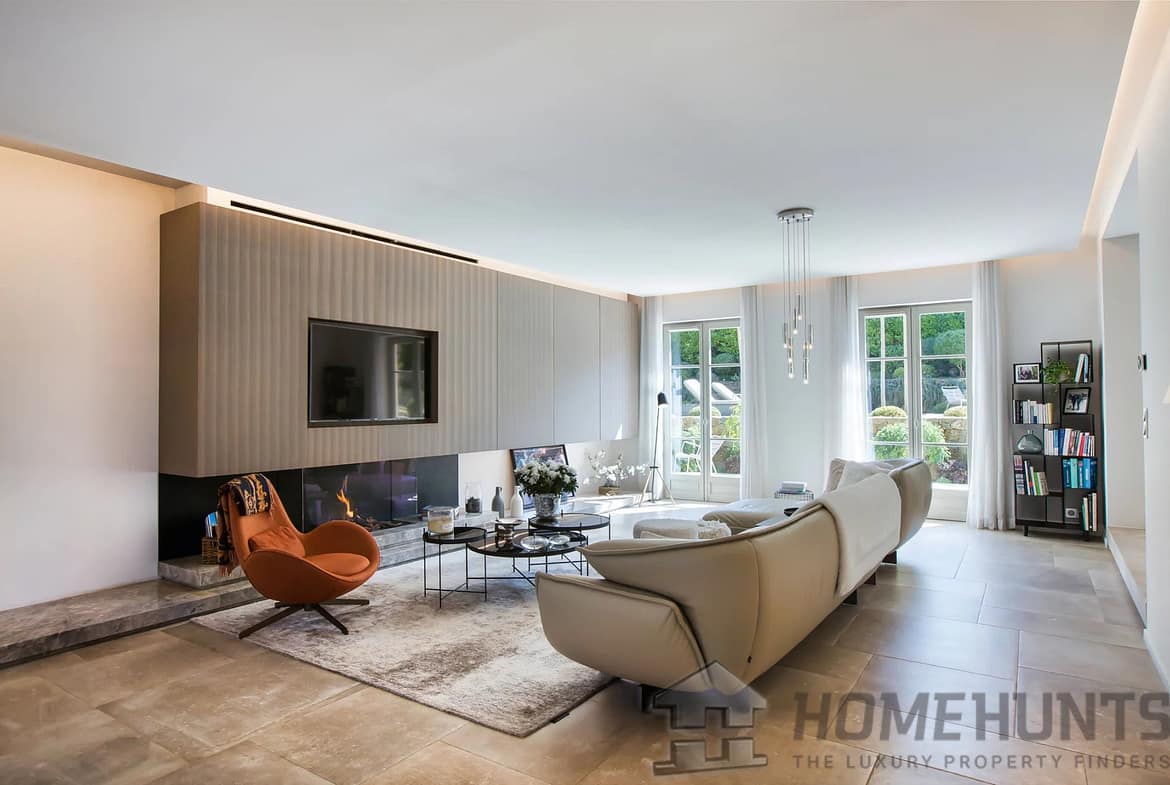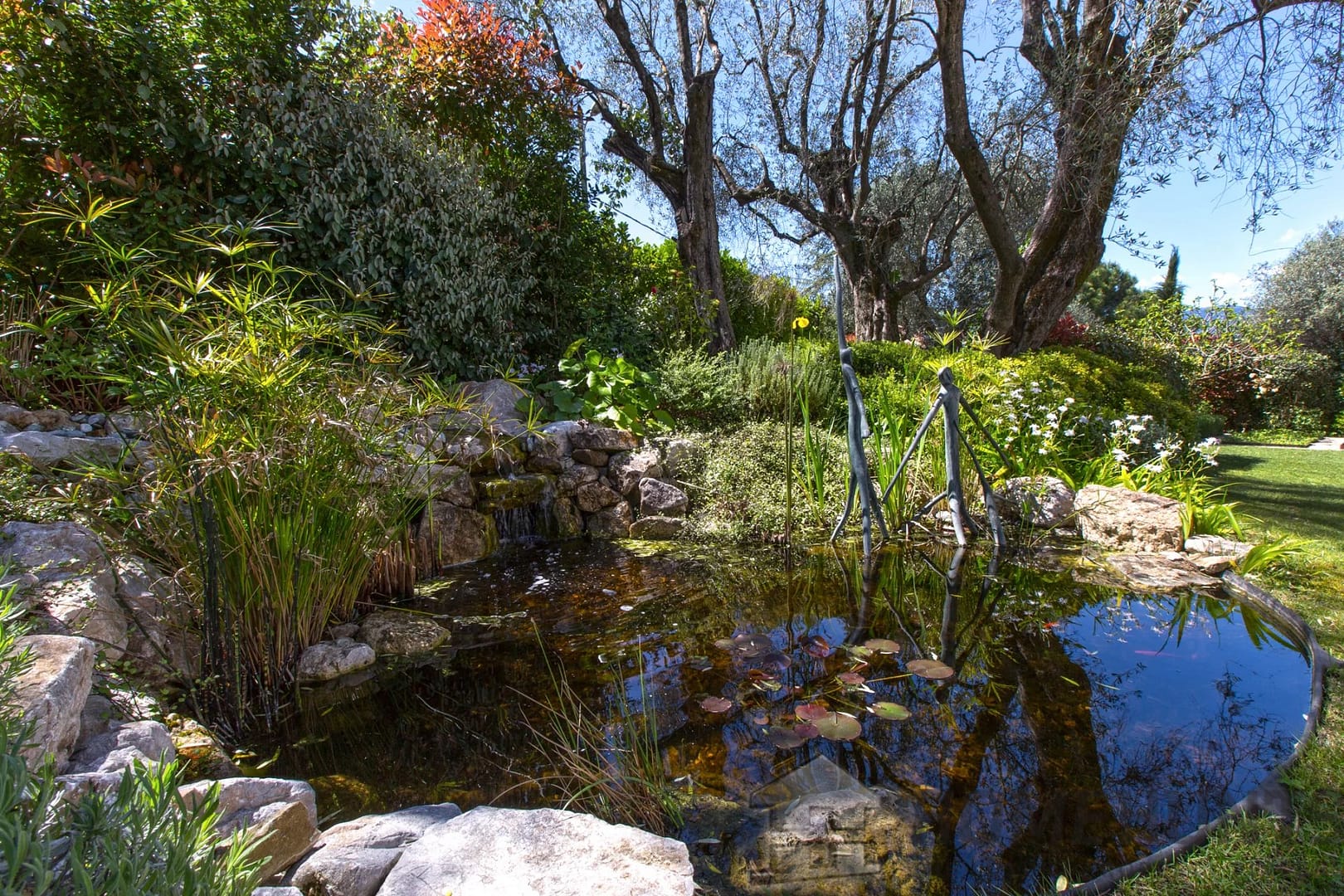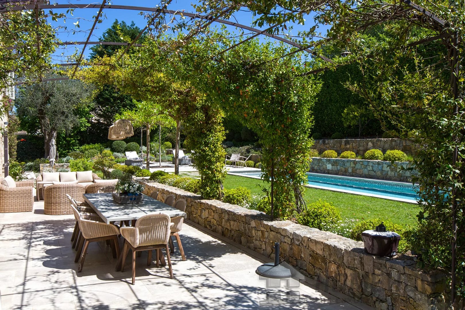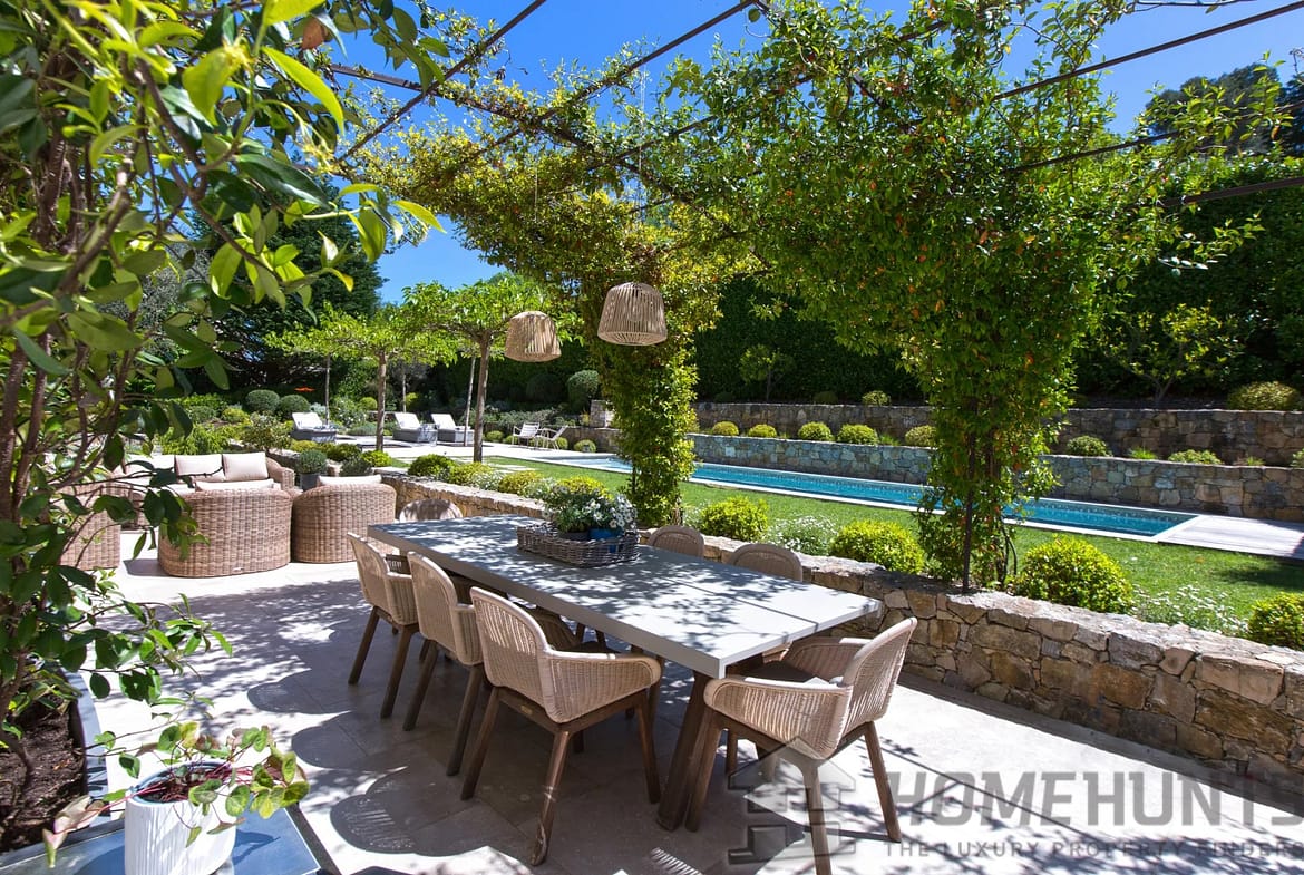 Outdoor spaces are equally impressive, with multiple terraces including a jasmine-covered pergola ideal for alfresco dining. The landscaped grounds create a private sanctuary, featuring a tranquil water feature and Mediterranean plantings.