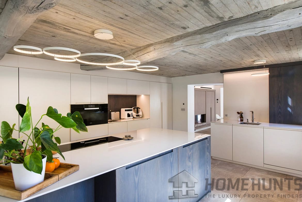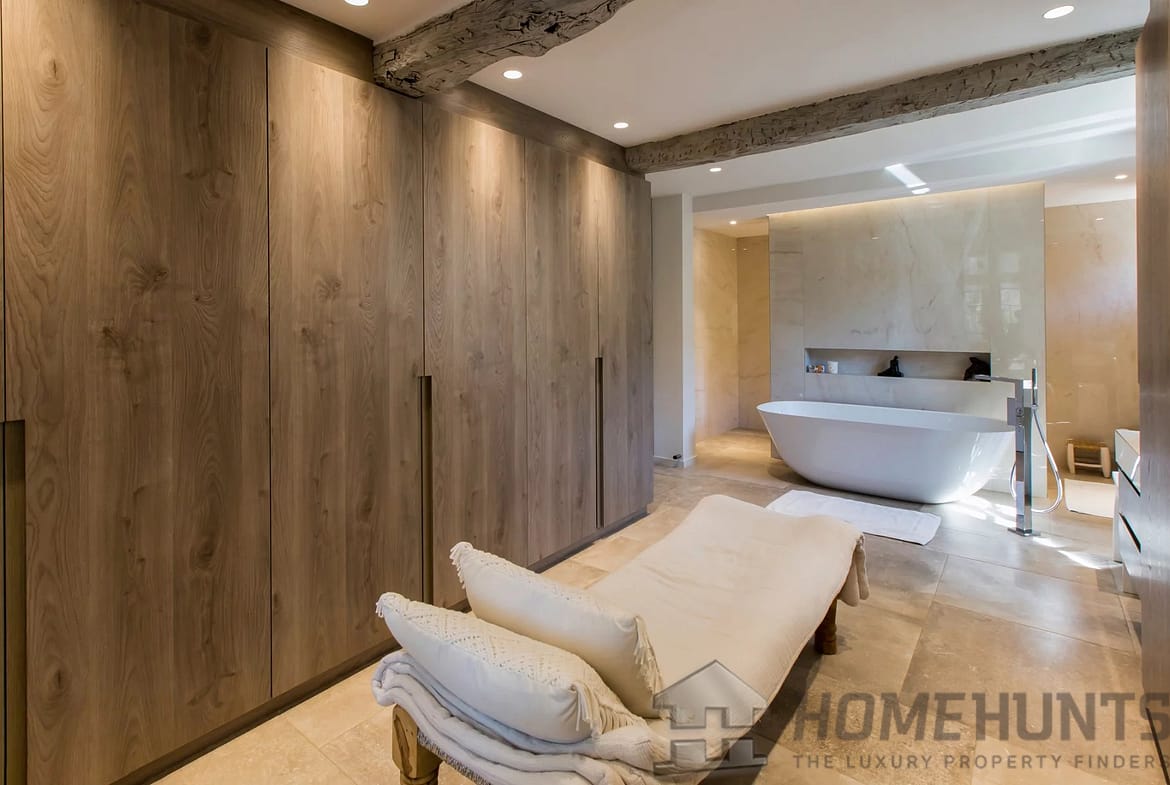 Internally, the home preserves historical elements like exposed beams, complemented by contemporary design. Spacious living areas include a fireplace-adorned living room, a dining room, and a sleek kitchen. Five bedrooms and four bathrooms offer luxurious accommodation.