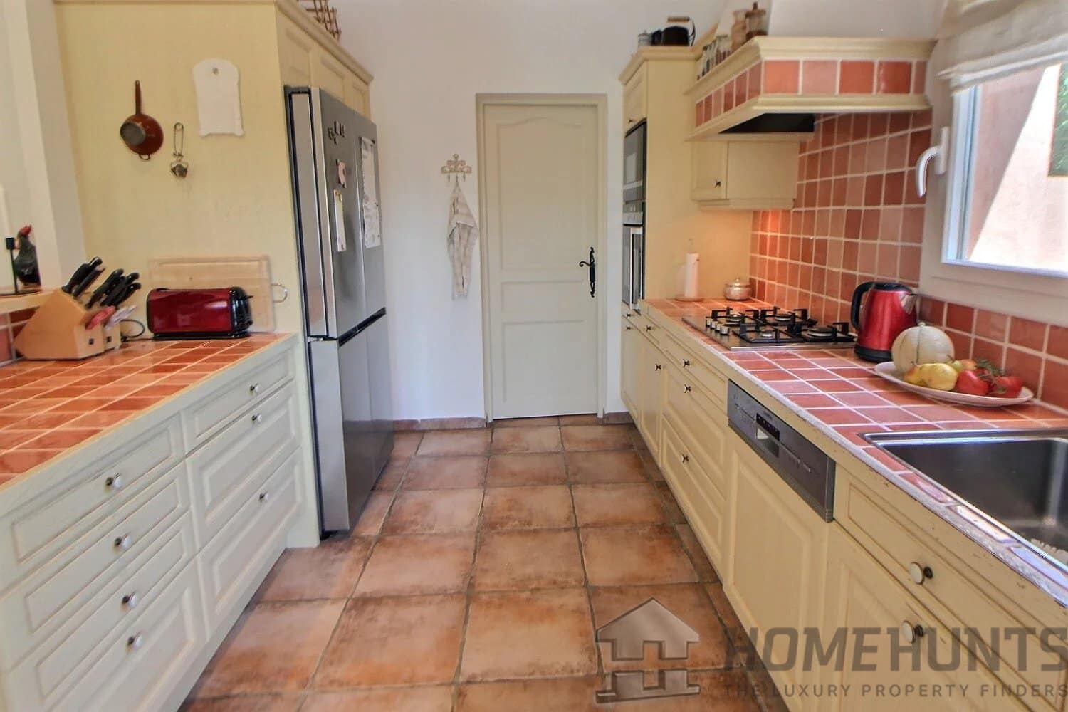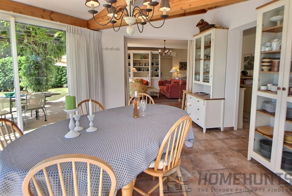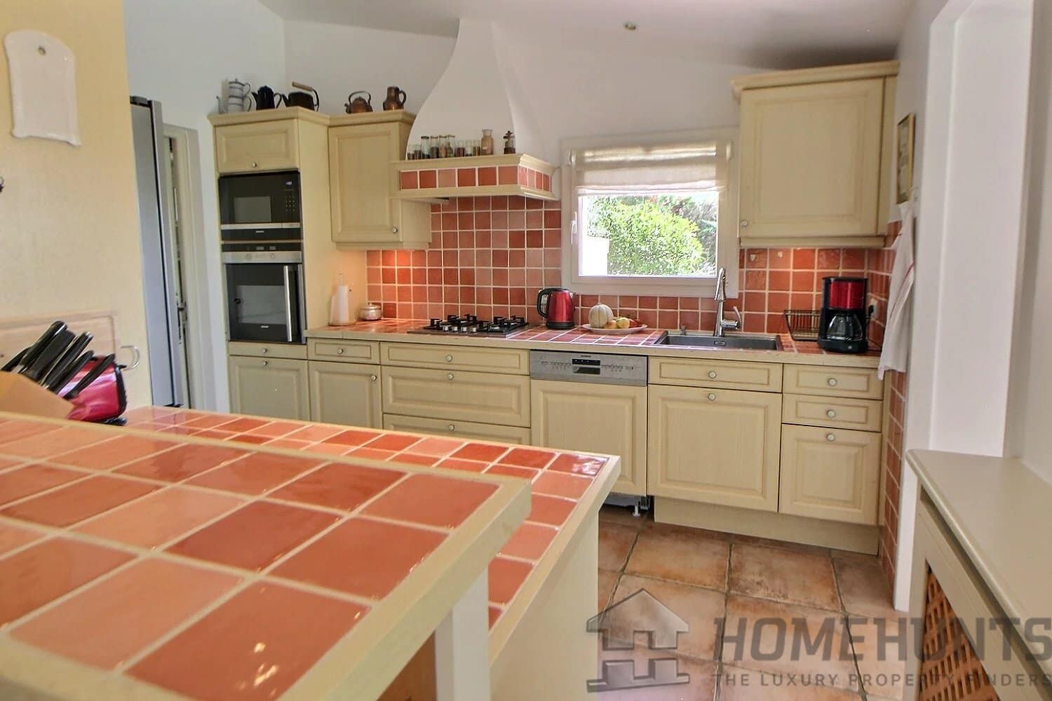 The ground floor welcomes you with a fluid open-plan layout including a dedicated dining room, inviting living room with fireplace, and a warm Provencal kitchen — each space opening seamlessly onto the terraces and garden, ideal for indoor-outdoor living and entertaining.