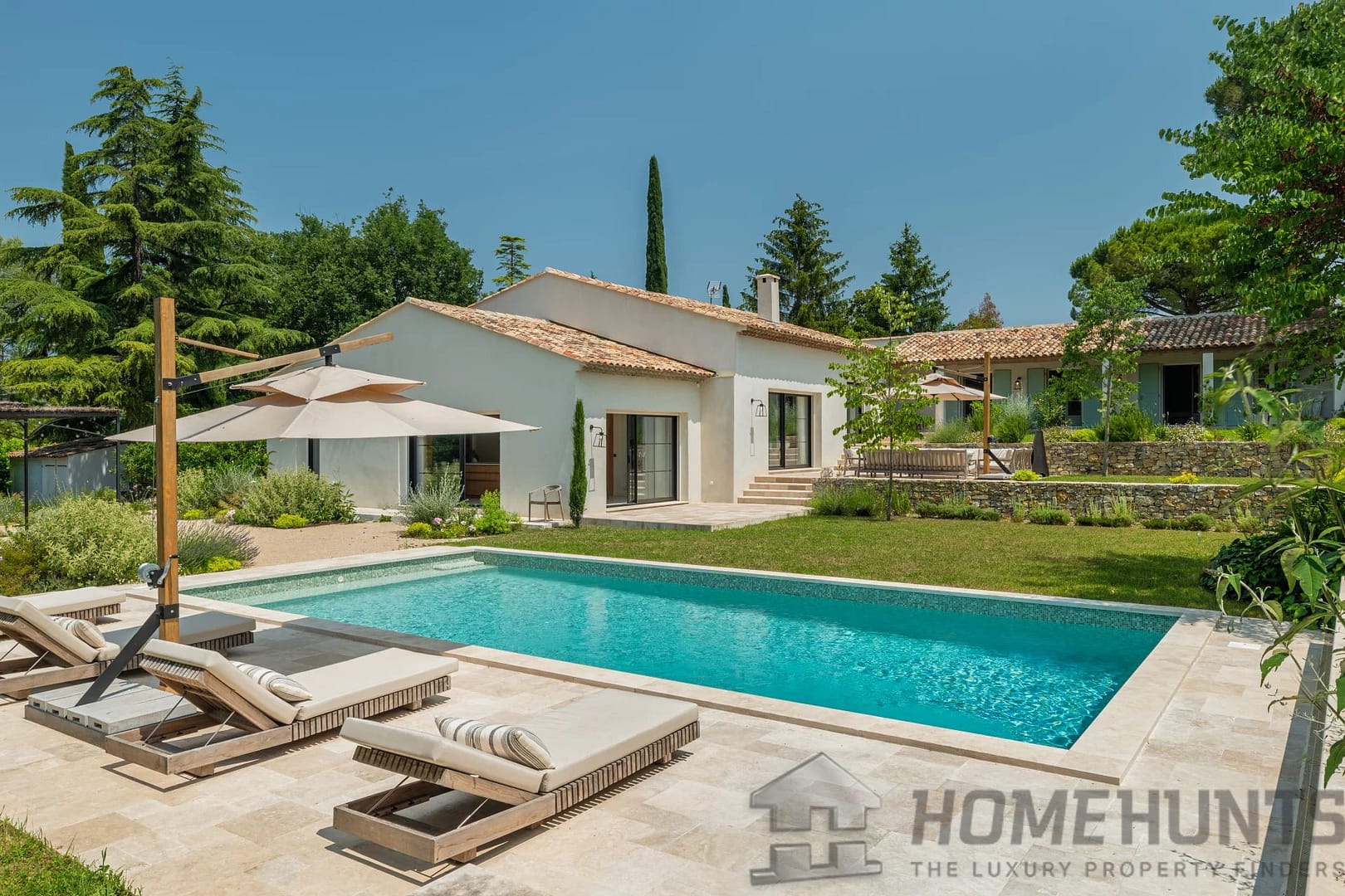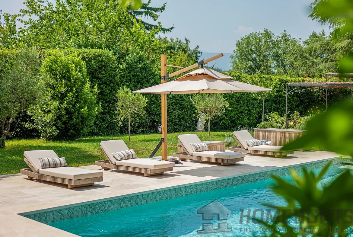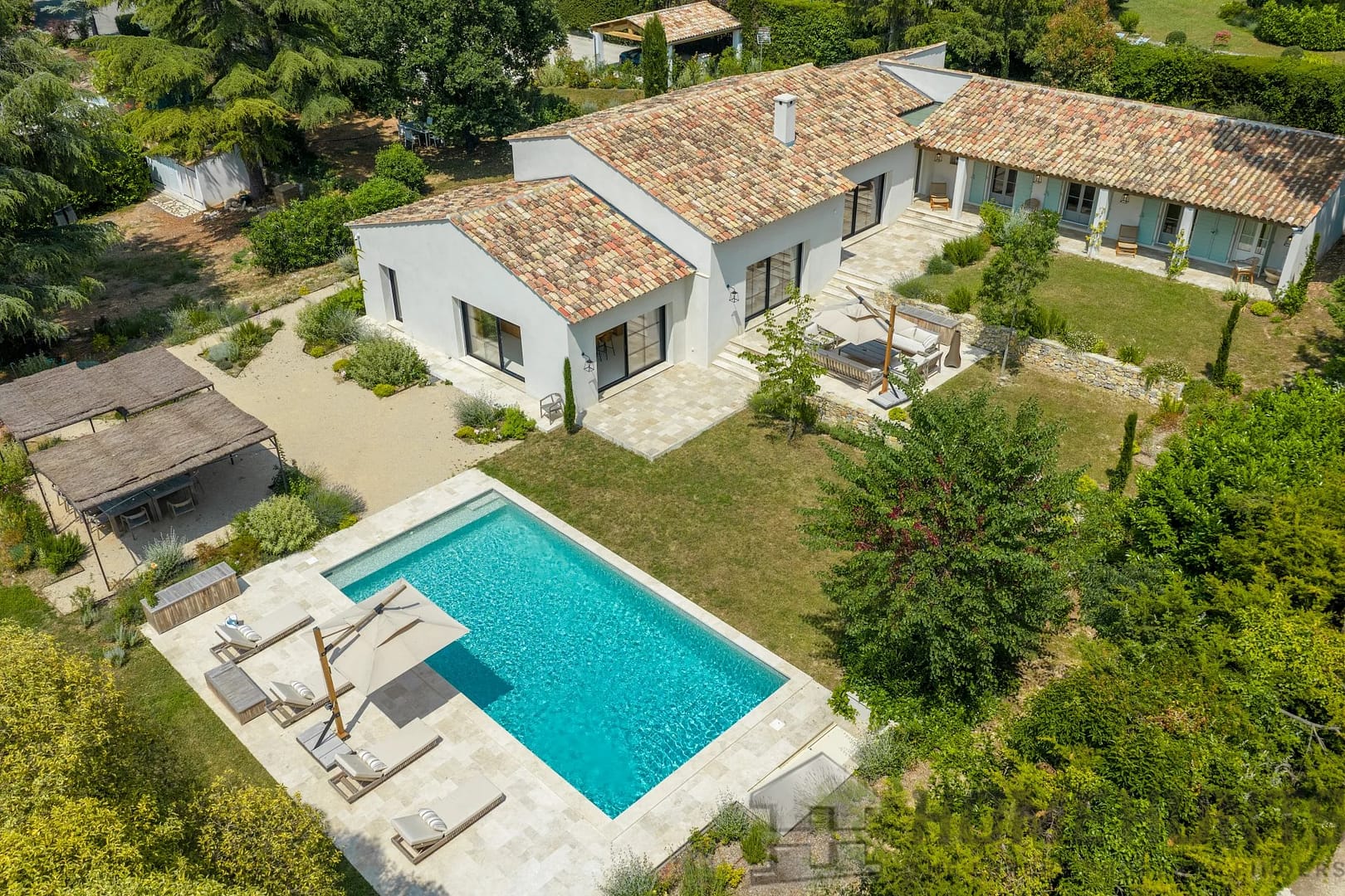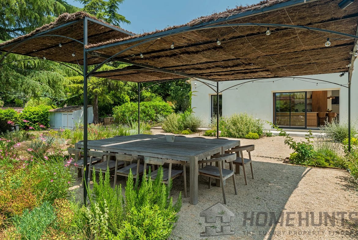Outside, the flat, beautifully landscaped grounds feature a large swimming pool, numerous terraces for convivial moments with friends or family, and a two-car carport with electric vehicle charging station.