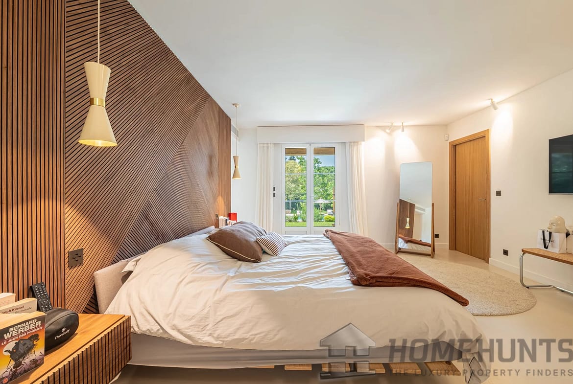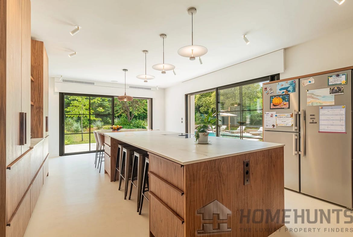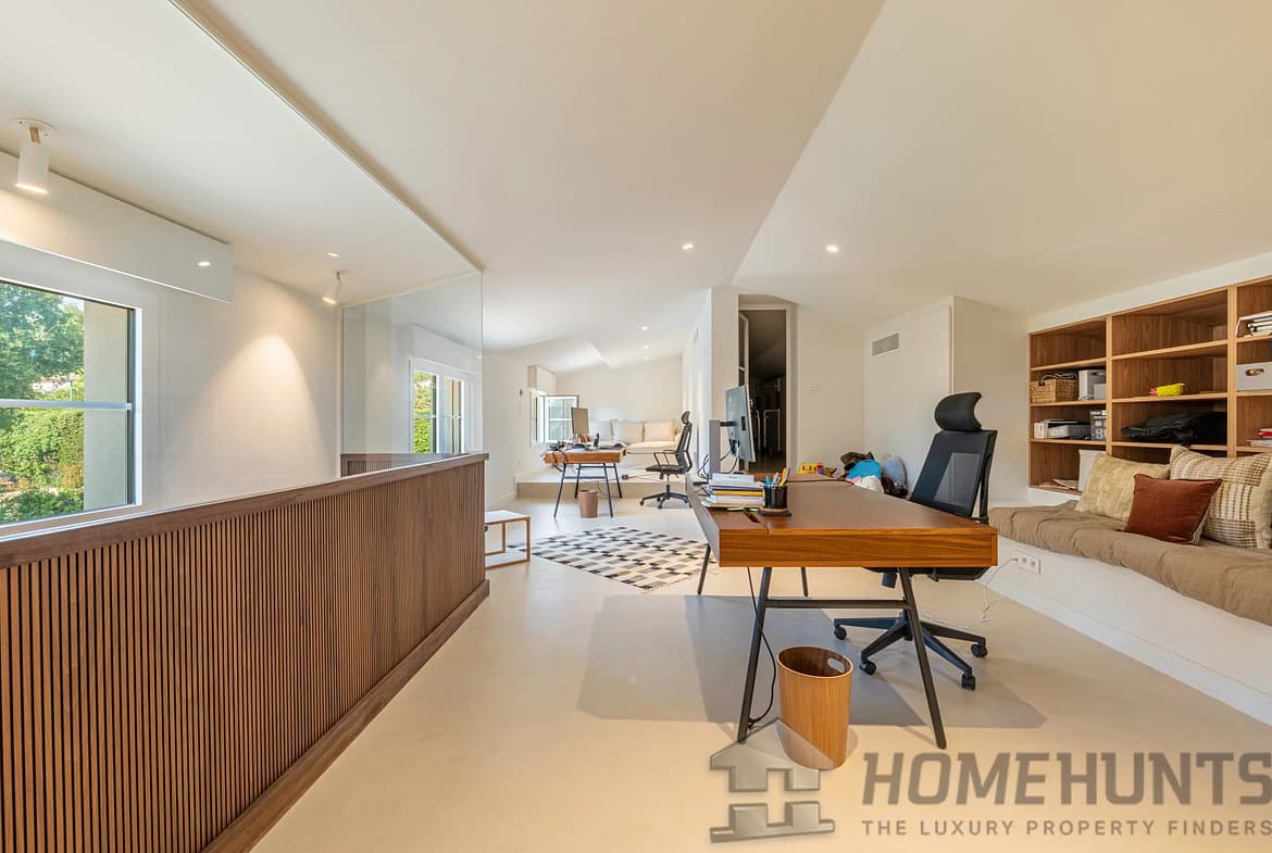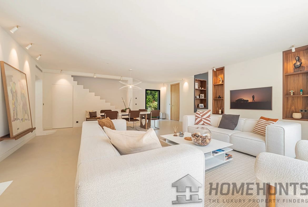 Designed for a refined lifestyle, the property is almost entirely on one level, with generous volumes and meticulous finishes. The vast, light-filled reception areas open onto the outdoors and are complemented by a fully-equipped contemporary kitchen, several comfortable suites and a cosy TV lounge. A gym and outdoor sauna complete this space dedicated to well-being and relaxation.