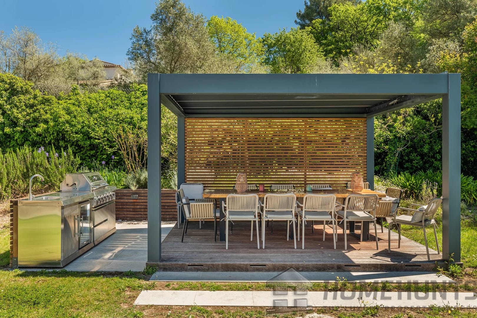 The swimming pool impresses with its exceptionally attractive shape and is surrounded by a summer kitchen with barbecue and a pretty pergola.