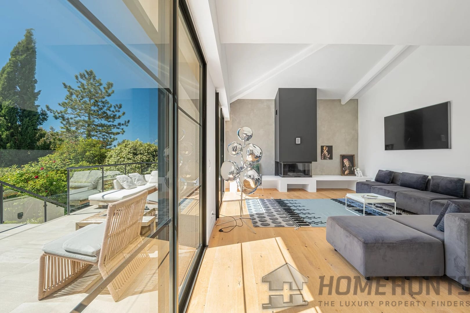 A few steps lead to the bright living area with fireplace, which connects directly to the beautiful terrace through large sliding doors.