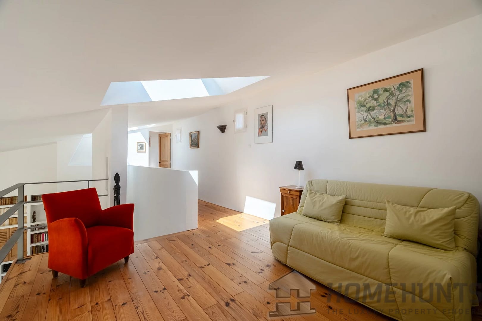 On the ground floor, a vast open-plan living room combines the living room, dining room, and fully equipped contemporary kitchen. The large bay windows frame the garden view like natural canvases, while the cathedral ceiling emphasizes the elegance of the space.
