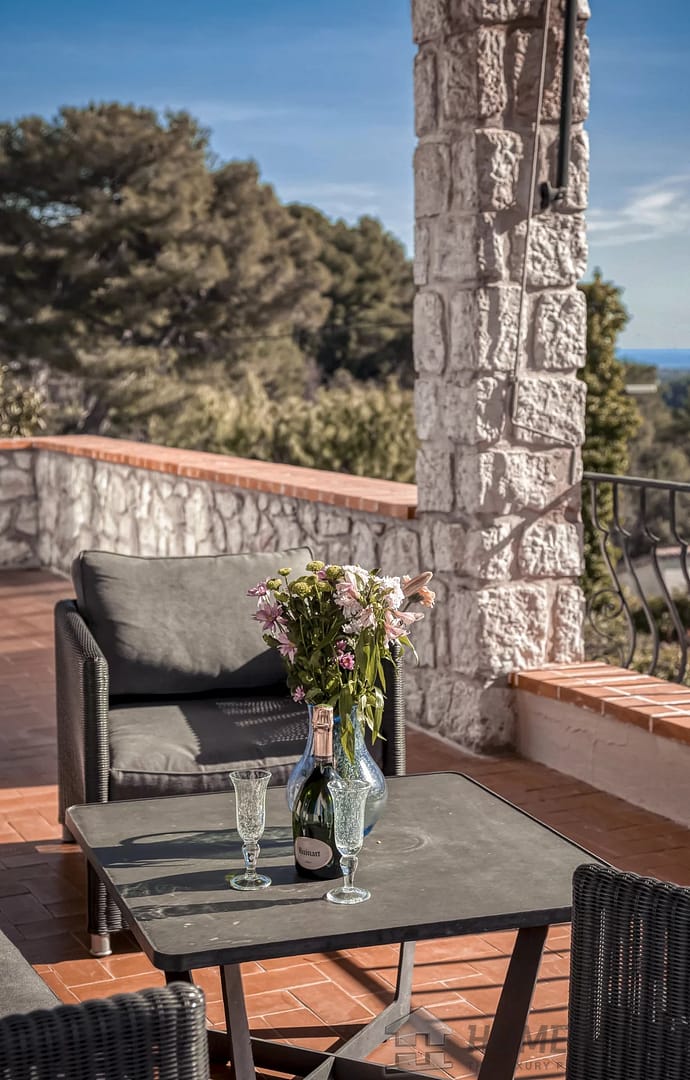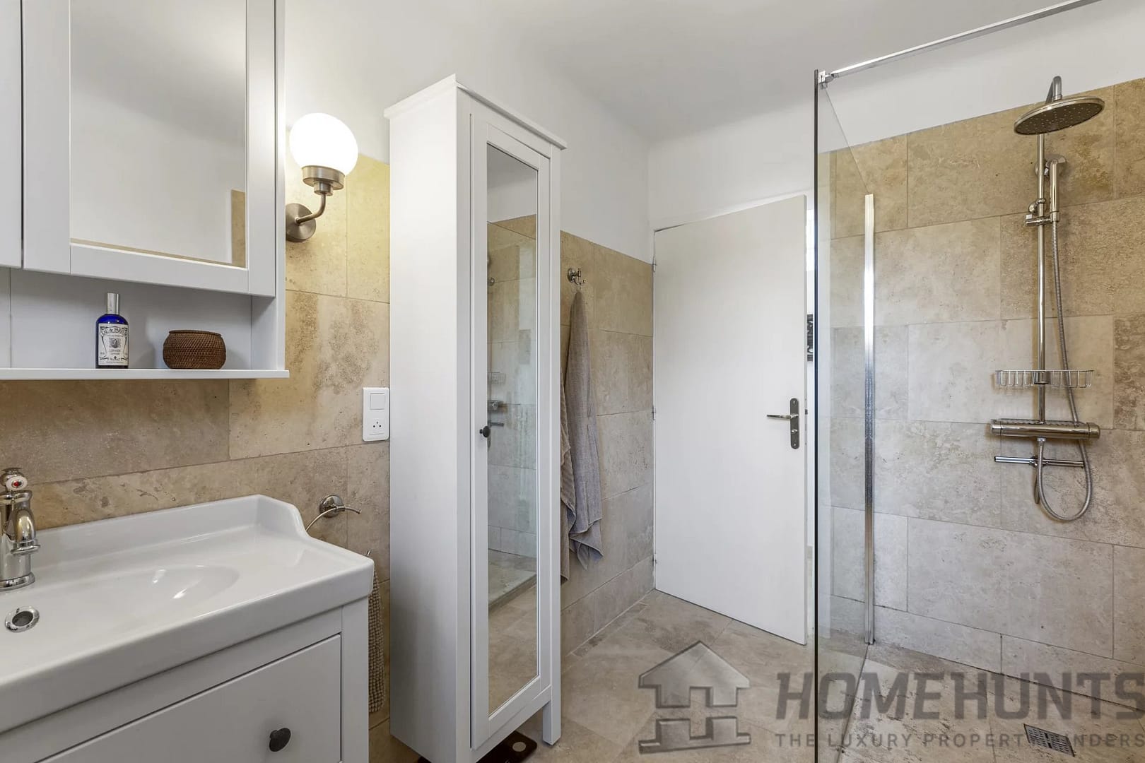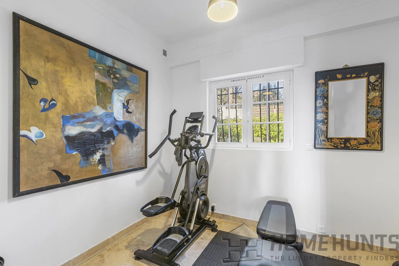 Once inside, on the garden level, a large storage area, a laundry room and the possibility of converting it into an independent apartment await you. The first floor features an entrance hall, a separate toilet with storage space, a separate kitchen and a gym that can also be converted into an office or bedroom. You’ll also find a shower room with WC, a bright bedroom opening onto a large terrace, and a living-dining room with fireplace, also facing this vast terrace, from where you can enjoy a breathtaking view of the sea and surrounding greenery.