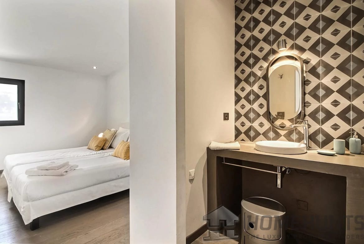 Going up to the first floor, you have the master bedroom with a double bed, bathtub, WC and his and hers sinks. The two other bedrooms both have twin beds and each one has their en-suite shower room and sink. These two share a WC.