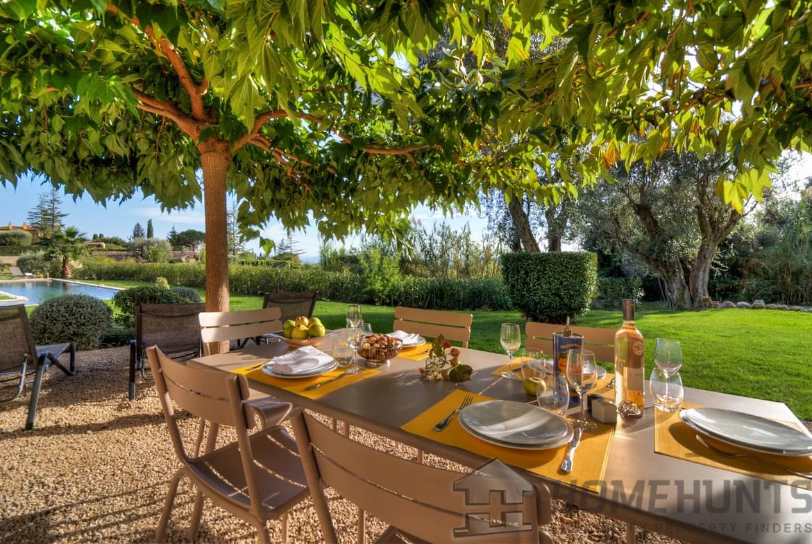 The 1350 m2 garden is flat and you have a 16×4 meter salt water pool that offers views down to the sea and the Esterel mountains. The outdoor dining area is located underneath two mulberry trees that offers shade and a cosy atmosphere while enjoying your al fresco dining.