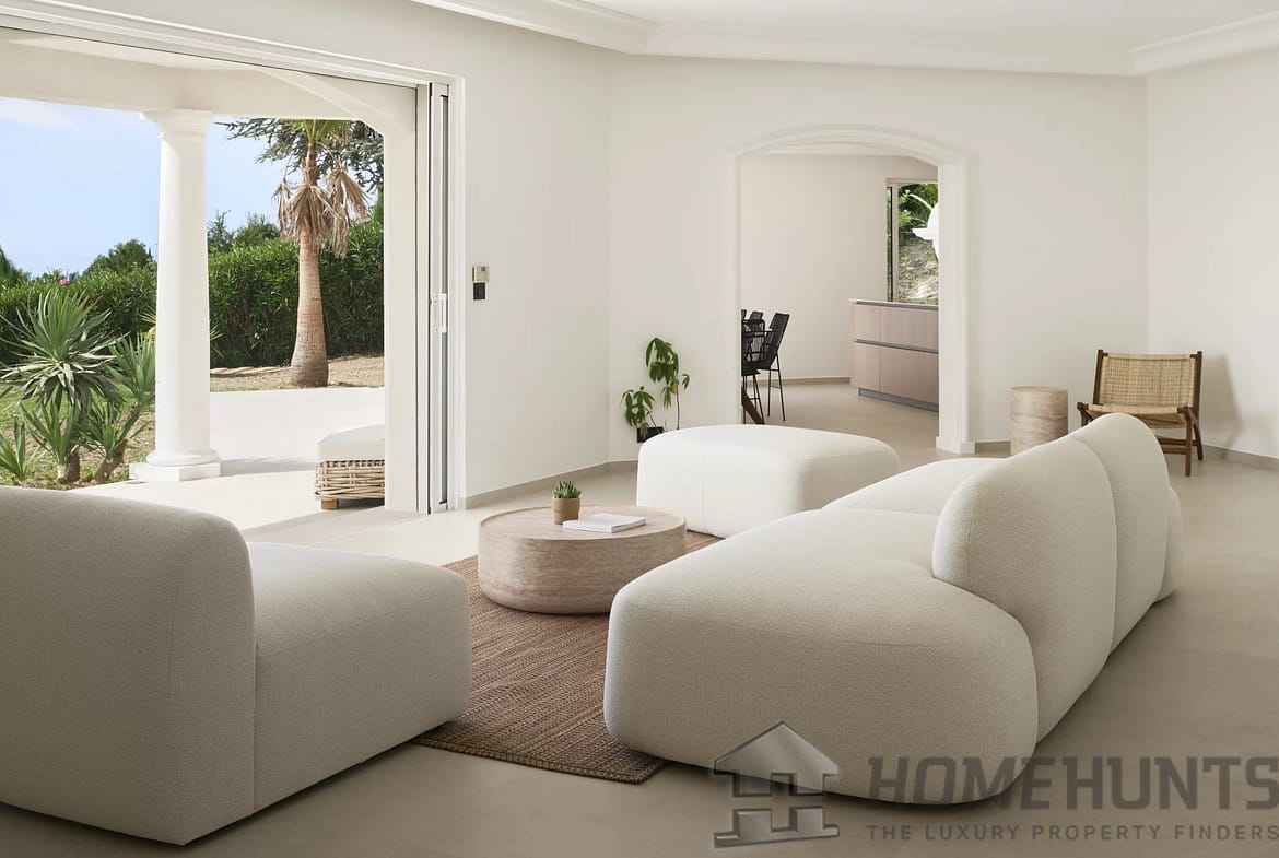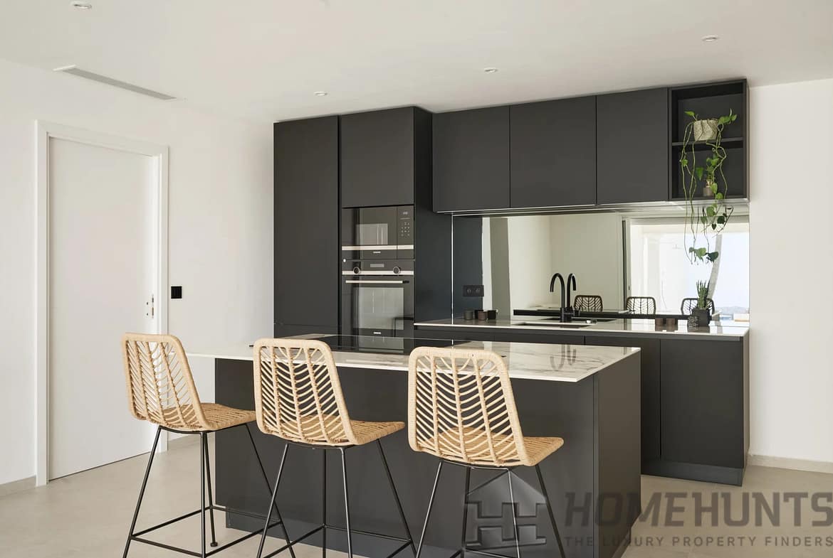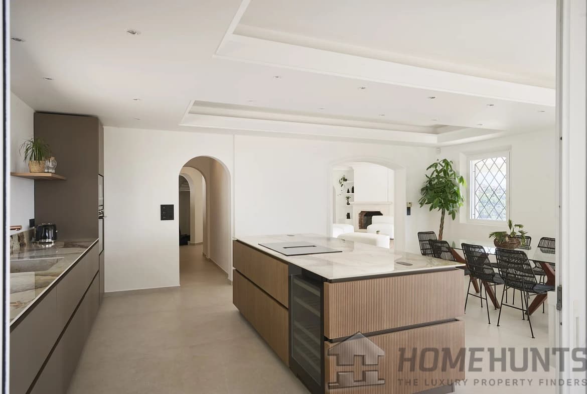 On the garden level, there is a separate 73 m2 apartment comprising two bedrooms, a bathroom, and a living room with an open-plan kitchen opening onto the terrace with sea views, adjacent to the swimming pool.