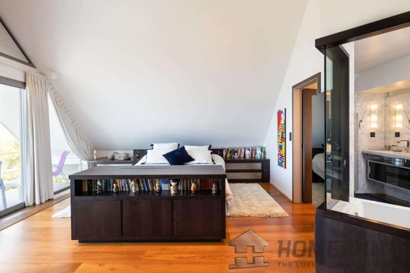 The peaceful property stands in a beautifully landscaped garden of 4.300 m2 with infinity swimming pool.
