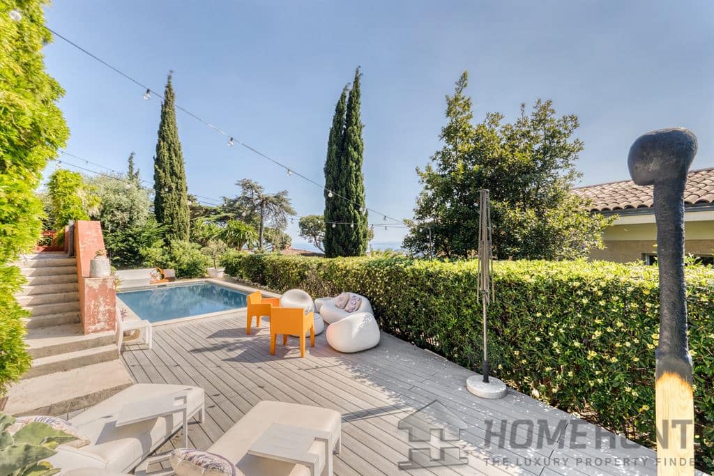 Outside, a private swimming pool with sea view, shaded terraces and a lush garden invite relaxation throughout the seasons.