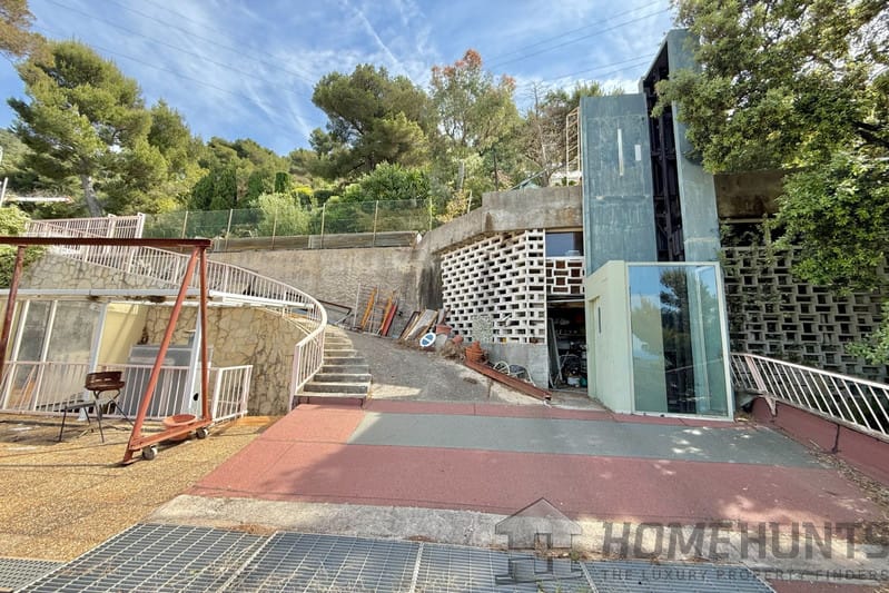 Facing due west, it enjoys a peaceful environment and unobstructed views, while providing ample parking, including the possibility to park several vehicles on the roof of the house, directly accessible from the road via an elevator connecting the different levels.