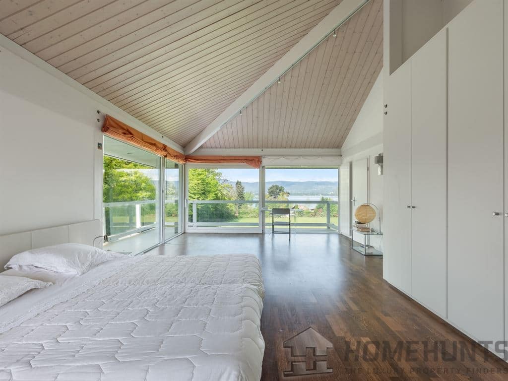 Upstairs, you will find two additional bedrooms and a master suite with a balcony facing the lake. Each bedroom features its own private bathroom and separate WC, ensuring optimal comfort and privacy. The lower level includes a large games room, several storage rooms, and multiple cellars.